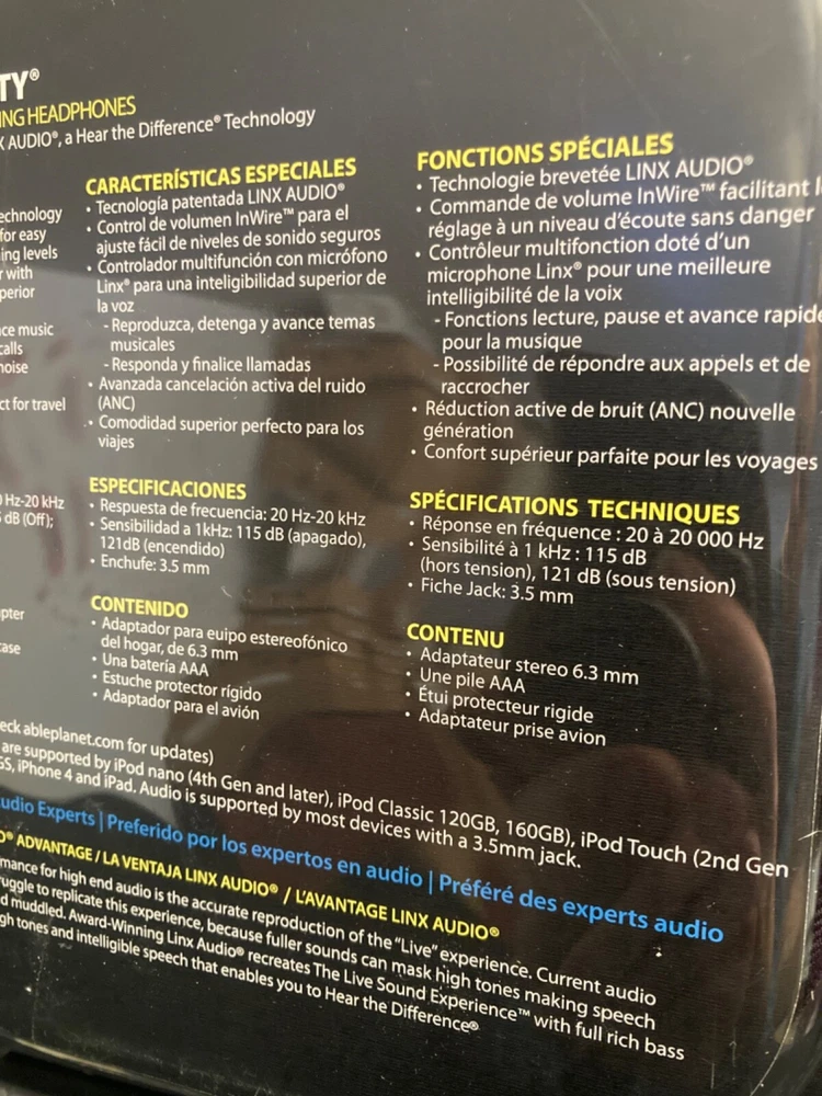 Experience high-quality sound with the Able Planet True Fidelity Active Noise Canceling Headphones. These ear-cup headphones have a double earpiece to provide a more immersive audio experience. The Linx Audio model is designed with a sleek silver and black color theme that is perfect for any style. These headphones have a wired connectivity option with a 3.5mm jack for easy attachment to your favorite devices. (compatible with iPod, iPad, older model iPhones, Smart Phones with a jack insert, laptops) Great for kids and their devices like LeapFrog, etc! The active noise cancellation feature eliminates distractions and allows you to enjoy your music without any external noise. Get ready to enjoy your travel experience with these comfortable and stylish headphones.
