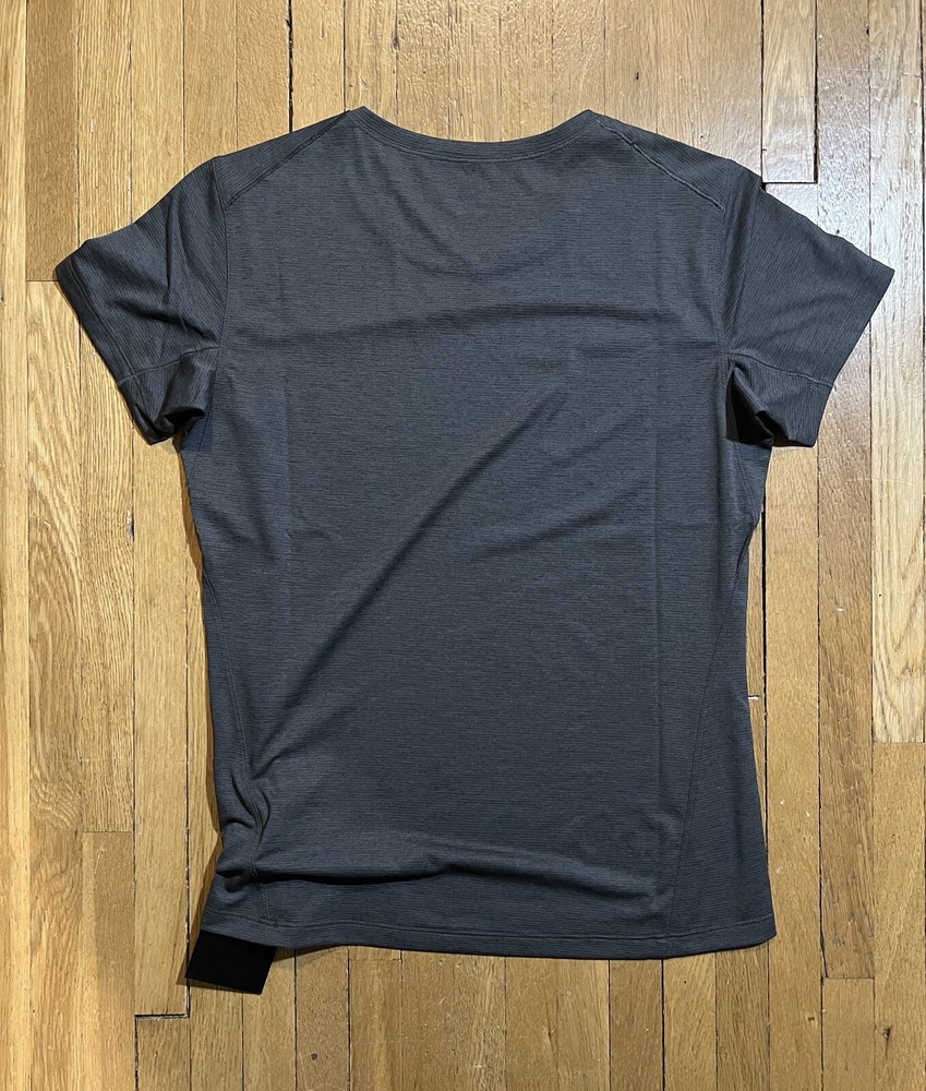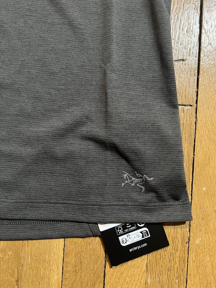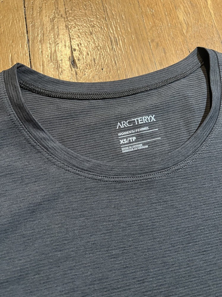 This is a new Arc'teryx Women's Taema Crew Short Sleeve T-Shirt in size XS. The shirt is in black heather color with a regular fit and medium fabric wash, making it suitable for activewear. It is designed for women and features short sleeves, making it a practical and stylish choice for various physical activities.