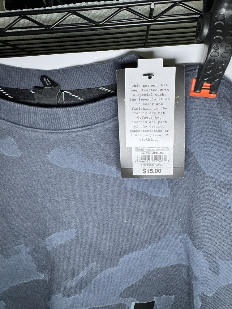 This NWT boys' sweatshirt by art class features a dark blue camouflage pattern, making it perfect for casual wear or outdoor activities. The pullover style sweatshirt has long sleeves and a crew neck, providing a comfortable fit for a size M 8/10. Made of a cozy fleece fabric blend of polyester and cotton, this sweatshirt is ideal for the winter, fall, and spring seasons. The design is themed around an army look, suitable for boys who enjoy a rugged and adventurous style.
