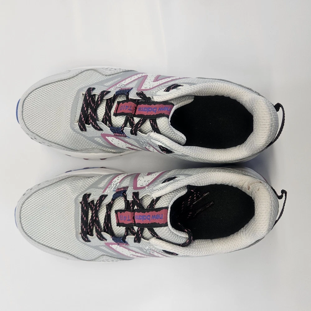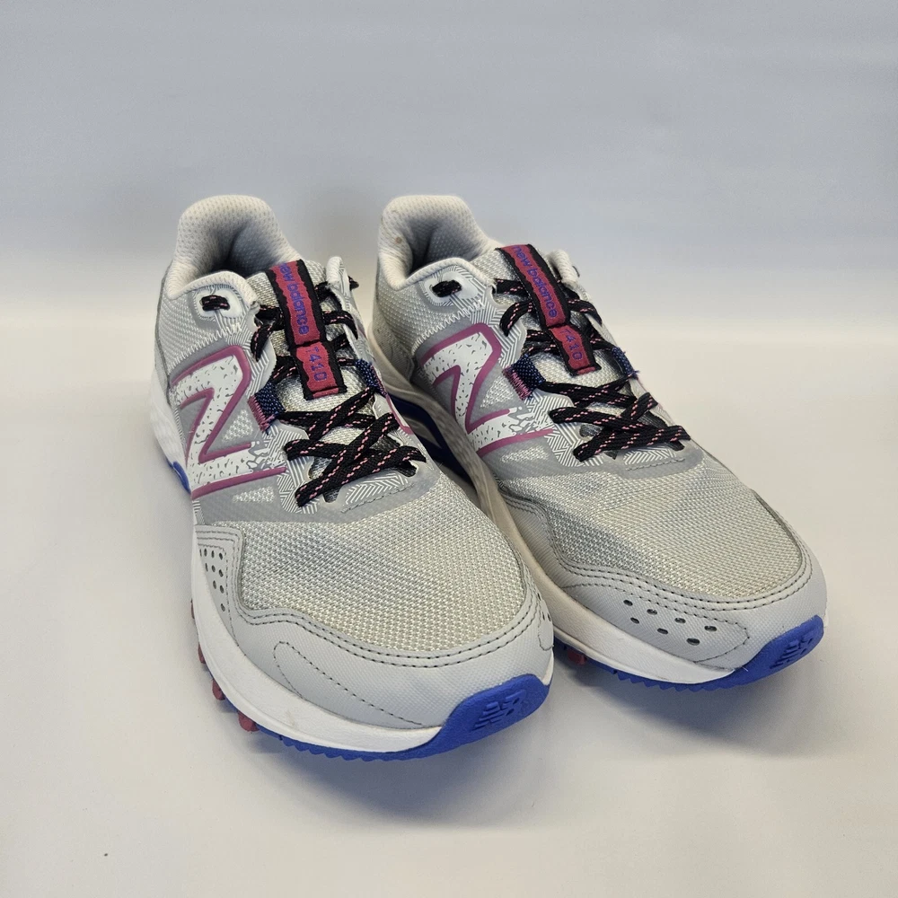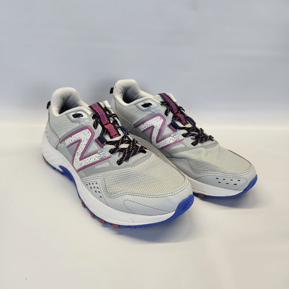 New Balance 410 V8 Trail Running Shoes WT410LR8 Womens 8.5 D Light Gray/Fuchsia Good preowned condition with normal signs of use. Run further and faster with the New Balance WT410. This sporty athletic features a lace-up front with a Comfort Insert to keep your feet comfortable on those morning jogs. Cushioned yet lightweight outsole provides a smooth ride. breathable mesh upper lace-up front with a pull-tab on the heel Cushioned Insert for a comfortable ride lightweight and comfortable midsole rubber traction outsole