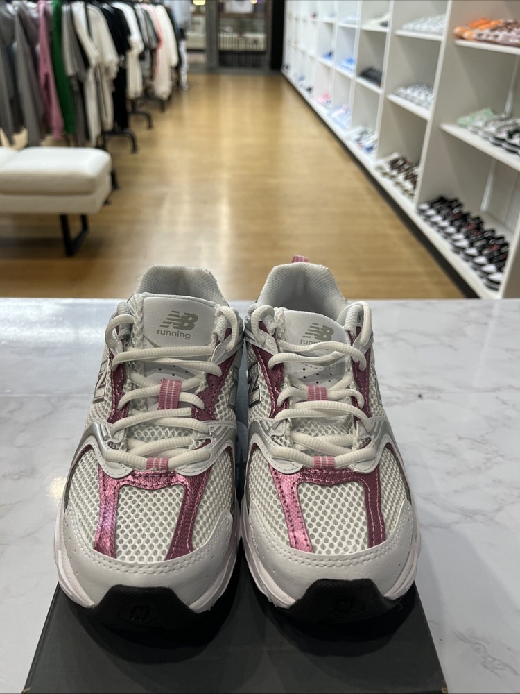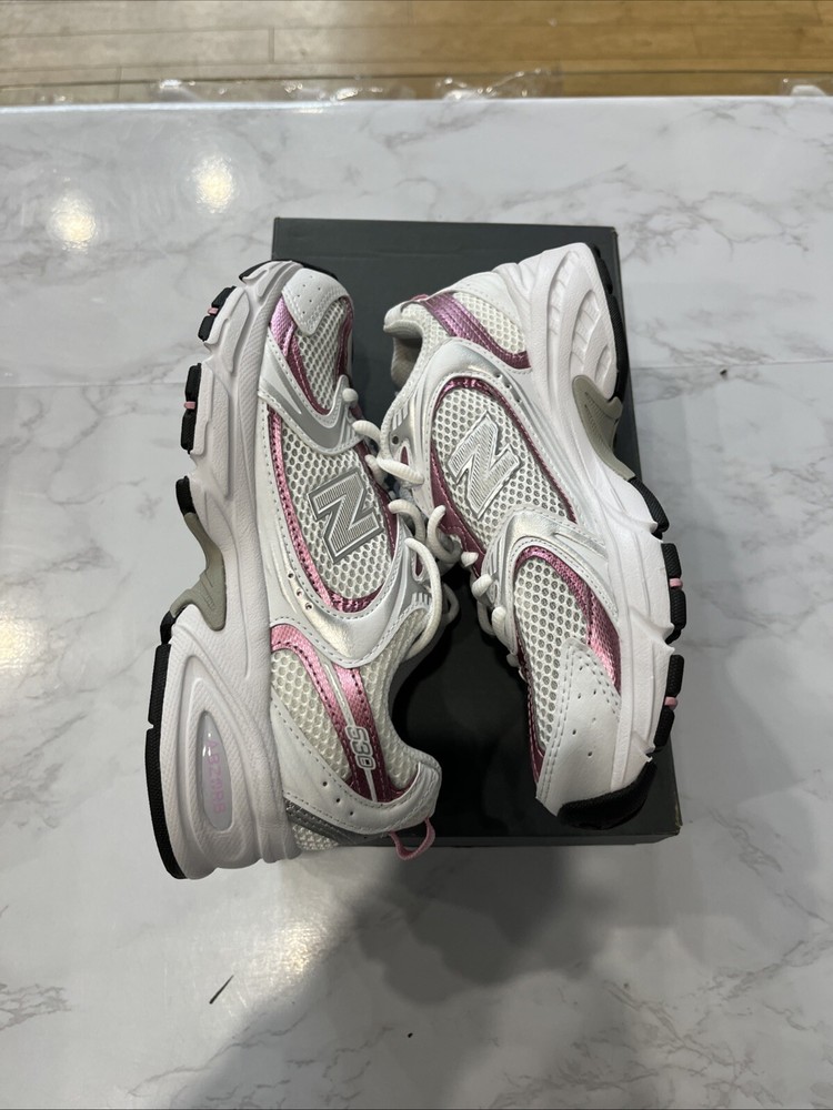 The product is a pair of New Balance 530 sneakers in a size 4 for men. They come in a Pink Sugar colorway and are in great pre-owned condition. The style code for these sneakers is MR530PK, featuring a mesh upper material that provides breathability and comfort. Part of the New Balance 530 product line, these sneakers offer a classic and stylish look perfect for athletic or casual wear in 2024. OGALL!