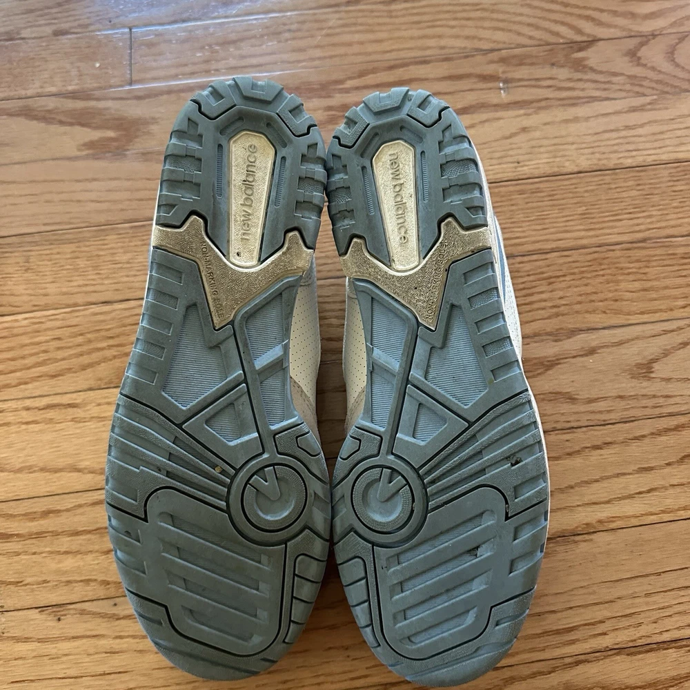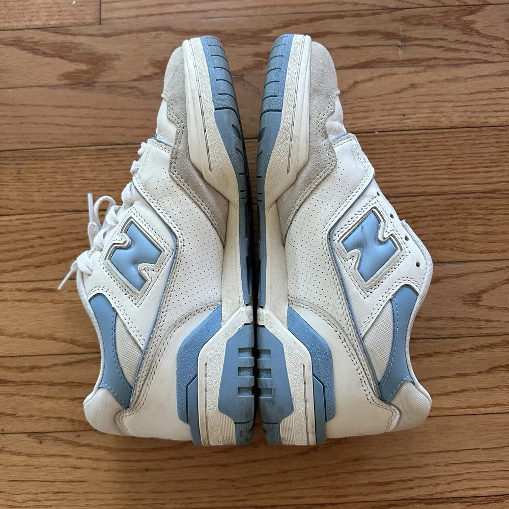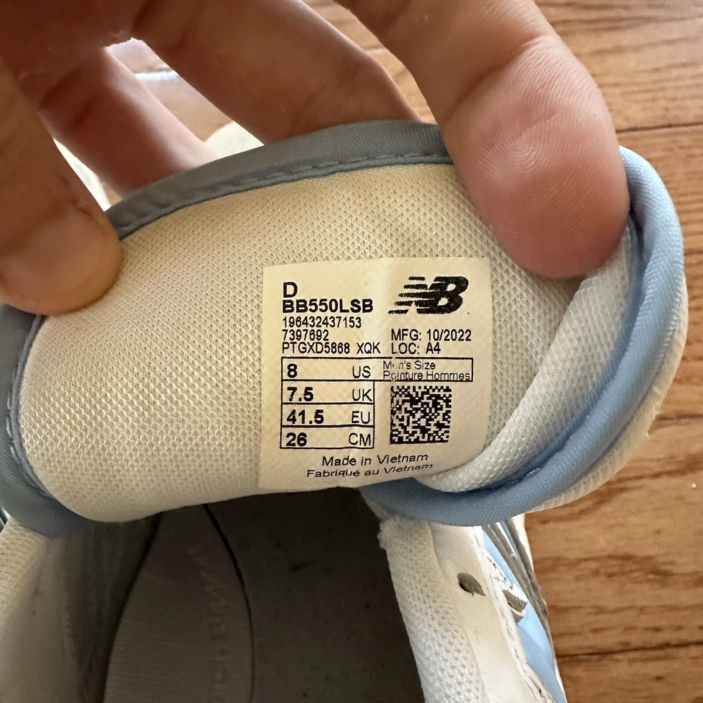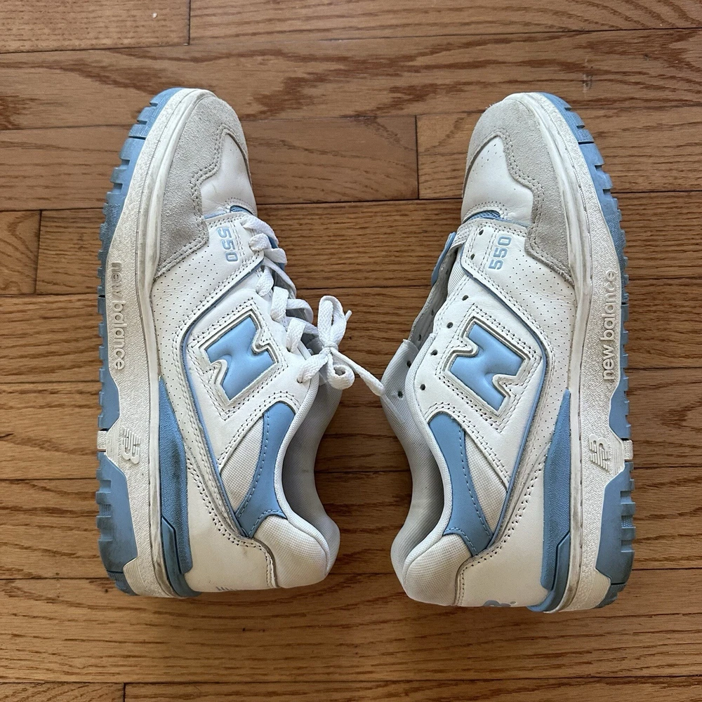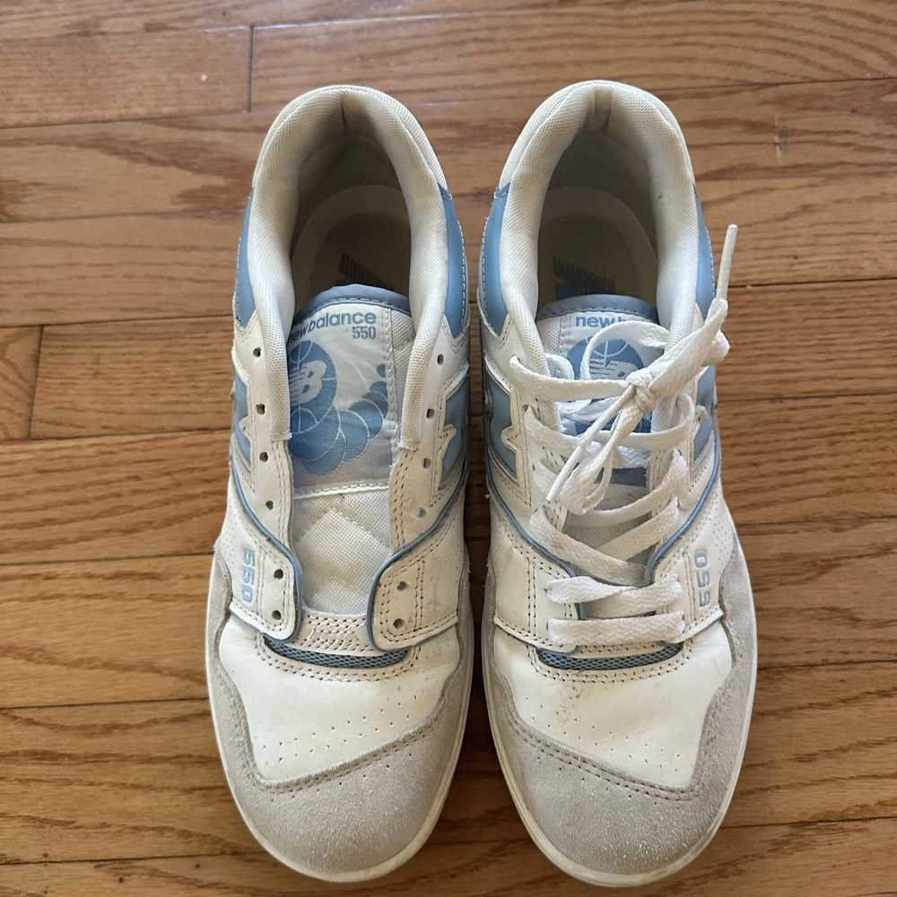 Please note photos. Right shoe is missing laces. Message any questions. Elevate your sneaker game with these stylish New Balance 550 Blue Haze athletic sneakers. Featuring a lace-up closure and a low-top shoe shaft style, these sneakers provide a comfortable and secure fit for any activity. The lightweight and breathable design, combined with a rubber outsole and foam insole, make them perfect for gym and training, walking, and basketball. With a colorful blue colorblock pattern and a white leather upper material, these sneakers are both fashionable and functional. The New Balance 550 model is part of the 500 series product line, and it was manufactured in Vietnam in 2022. These sneakers are available in US shoe size 8 and UK shoe size 7.5, and they are suitable for men who enjoy athletic shoes with a D shoe width. Get ready to hit the gym or the basketball court with these versatile and stylish New Balance 550 sneakers.