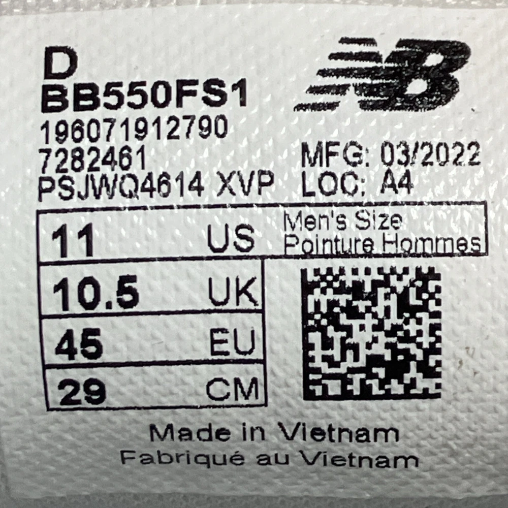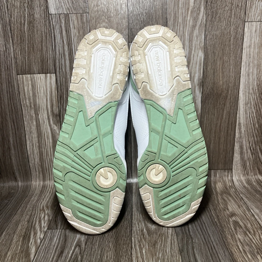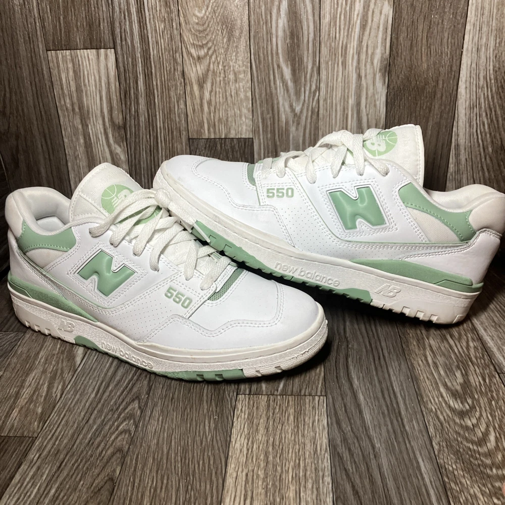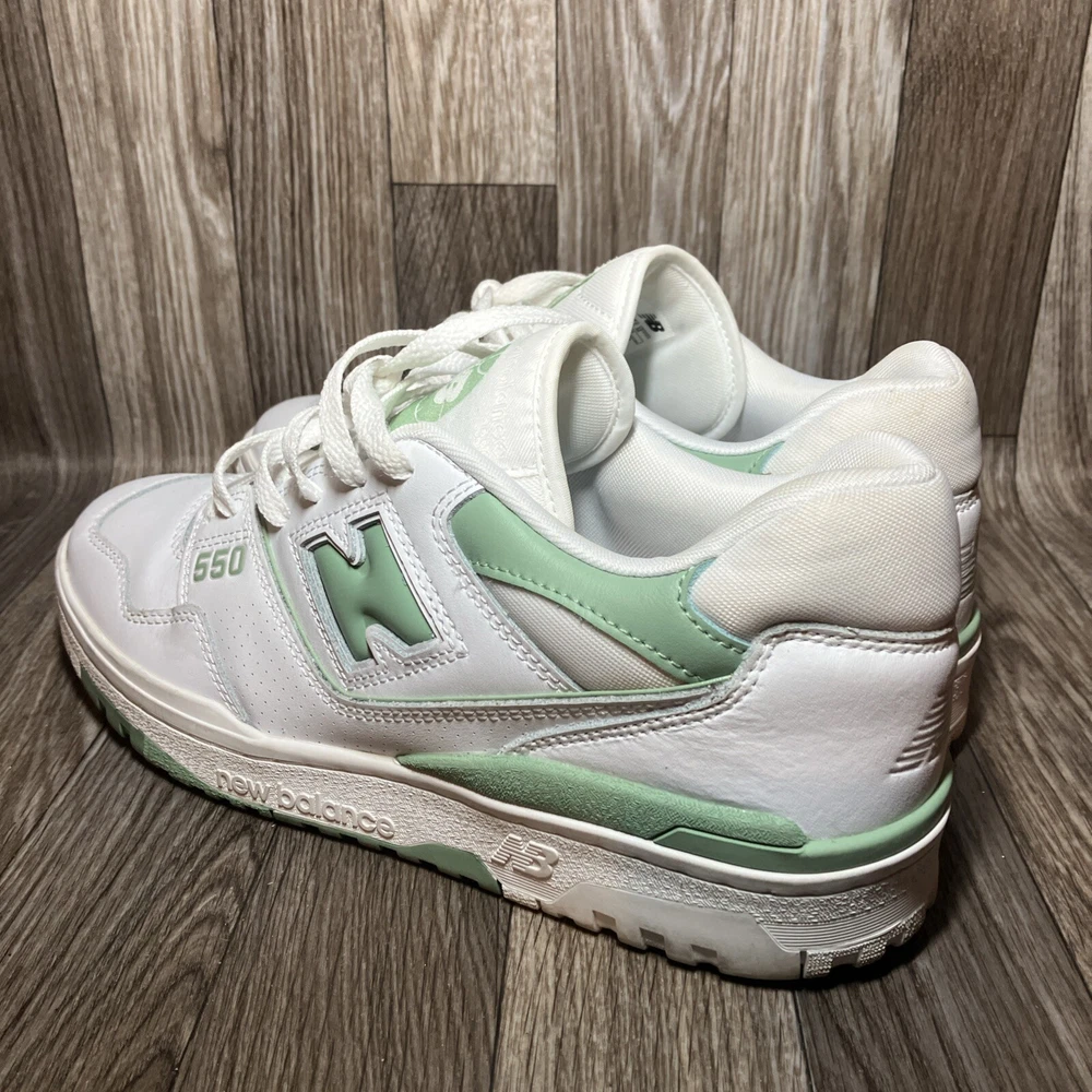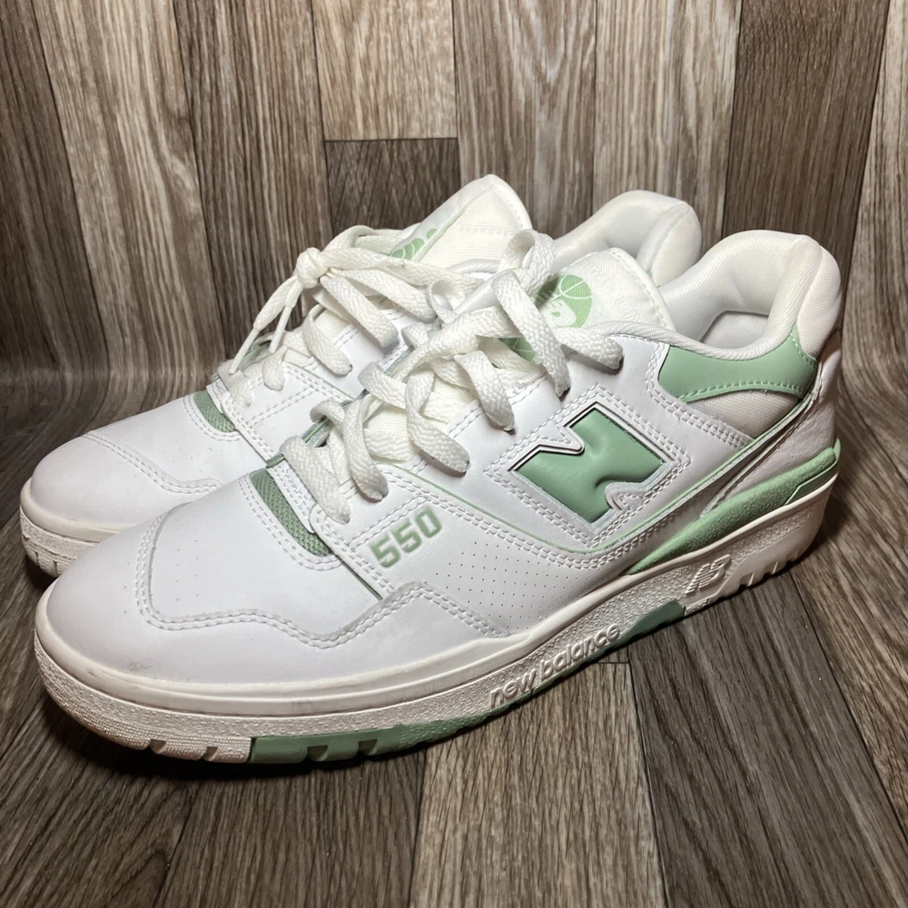 These New Balance 550 sneakers in white and mint green are a perfect addition to your shoe collection. Designed for men, these athletic shoes have a lace-up closure and a low-top shaft style. The cushioned and comfortable features make them suitable for various occasions, including activewear, casual, and workwear. These sneakers have a style code of BB550FS1 and were manufactured in Vietnam in 2022. They are perfect for walking, school, running, and jogging. The upper material is made of leather, and the shoes are available in size 11 with a D width. The nickname of these sneakers is "White Mint Green," and they are part of the New Balance 550 product line.