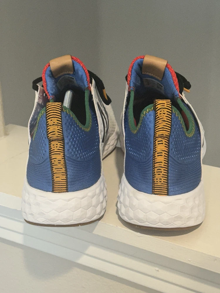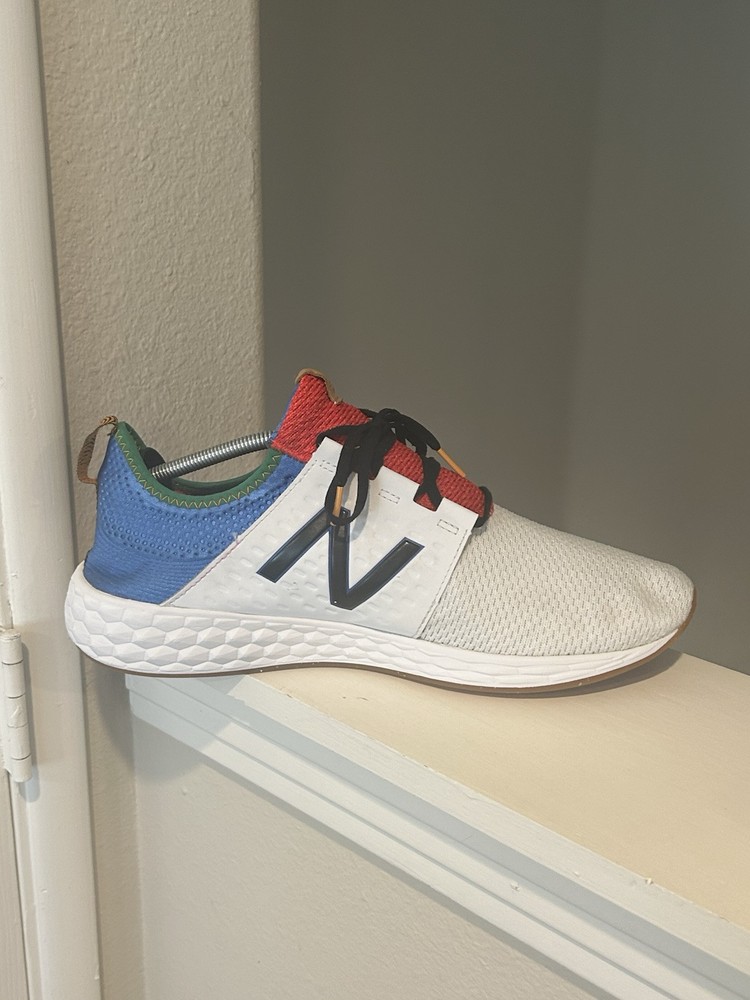 This is a New Balance Cruz Reissue sneaker in white, red, and blue, designed for men in size 14 2E. It features a lace-up closure, low-top shoe shaft style, with a synthetic upper material and rubber outsole. The shoe offers comfort, breathability, and performance, suitable for casual wear in all seasons. The design is colorful and sporty, part of the New Balance product line with a style code of MCRZRWC.