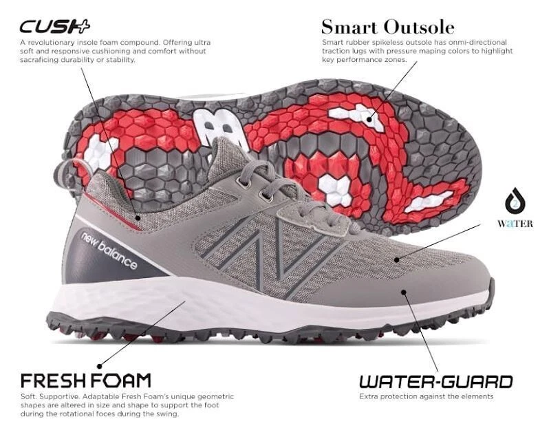 We are a reputable golf company that has been in business in St. Louis, Missouri since 1975. We have been doing this for 40 years because we do things right the first time. WE HAVE THE FASTEST SHIPPING ON EBAY! Don't believe us? Check out our Feedback. If you have questions, please feel free to ask. As always, thank you for looking. NEW! New Balance FreshFoam Contend Spikeless Golf Shoes (Style# NBG4006GRC) SIZE: 8.0 WIDTH: Medium (D) COLOR: Gray/Red CONDITION: New In Box (10/10) FEATURES • Waterproof microfiber leather / performance mesh upper • Smart rubber spikeless outsole has pressure mapping colors to highlight key performance zones • 10mm drop Fresh Foam® innovative midsole provides ultra-cush, cloud-like feel • Molded CUSH+® insole for superior comfort • Welded forefoot water-guard for extra protection • 2 year waterproof warranty • Weight 12.2 oz TECHNOLOGIES Fresh Foam: Soft. Supportive. Adaptable. Fresh Foam's unique geometric shapes are altered in size and shape to simultaneously provide ultra cush, cloud-like feel and perimeter stability to support the foot during the rotational forces during the swing. CUSH+: A revolutionary foam compound. Offering ultra soft and responsive cushioning and comfort without sacrificing durability or stability.