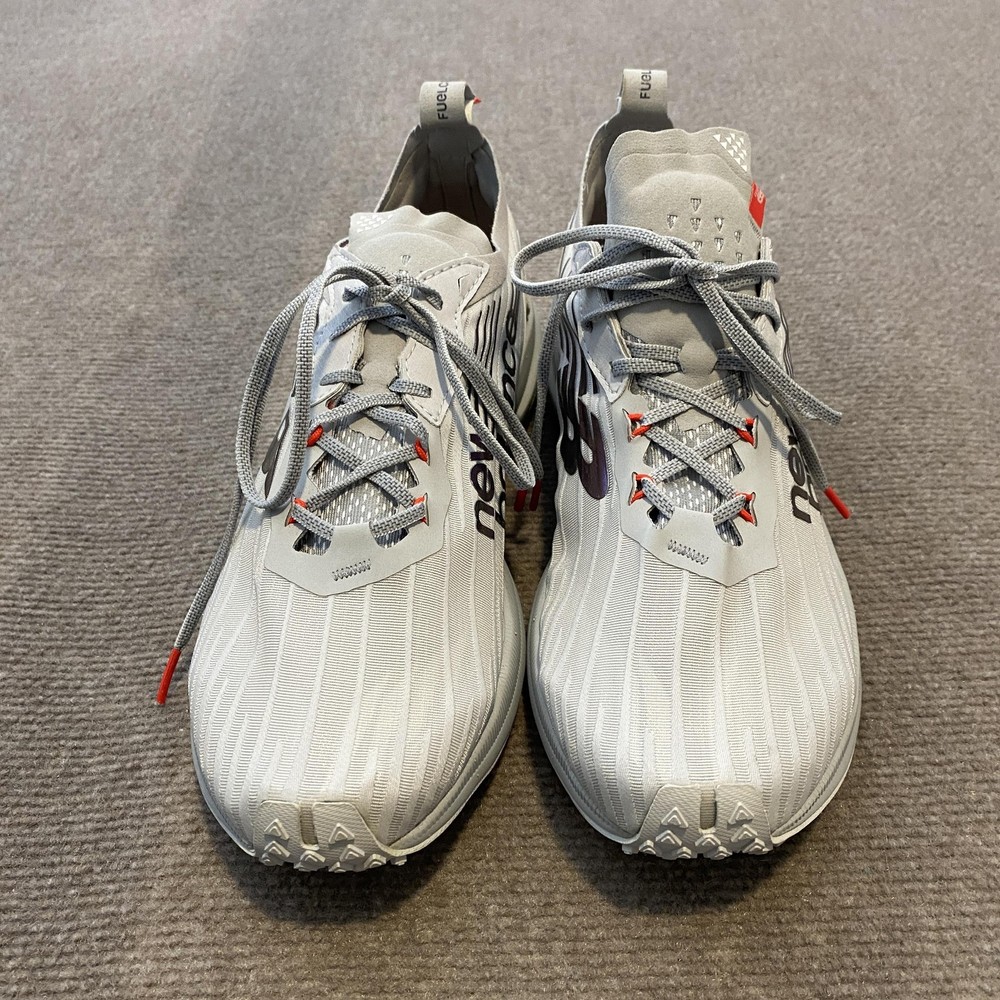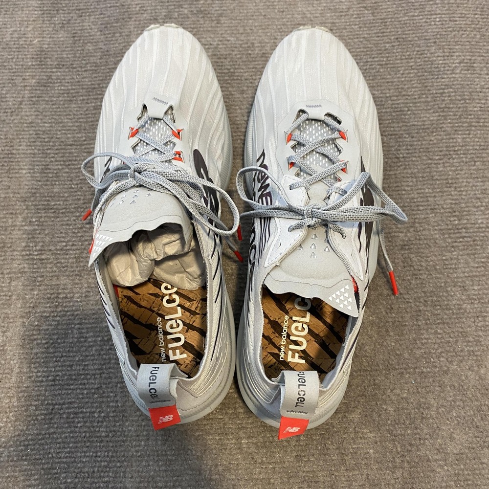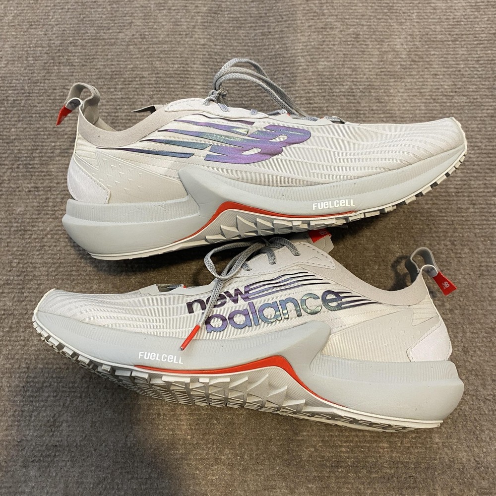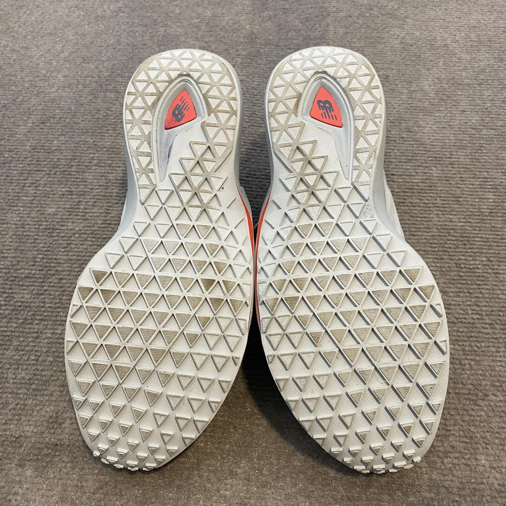 Pre-owned pair in clean, lightly worn condition. Mesh uppers, linings, and original FuelCell insoles are clean and intact with minimal creasing and no staining or tears. FuelCell midsoles and rubber outsoles show light dirt and very minor tread wear from limited use; laces and heel pull tabs secure, no box or extra accessories included. Brand: New Balance Style: FuelCell Drift womens low-top athletic running shoes designed for performance training and everyday road running. Color: Light gray upper with tonal striping, iridescent New Balance logos, gray midsole, and bright red/orange accent hits on lace tips and heel pull tabs. Size: Womens US 10.5; UK 8.5; EU 42.5; 27.5 cm (per inner size tag); standard width. Upper material: Lightweight breathable mesh/textile upper with subtle ribbed texture, integrated tongue construction, padded heel collar, and traditional lace-up closure for a secure, customizable fit. Midsole/outsole: Responsive FuelCell foam midsole for cushioned energy return and comfort, paired with a durable rubber outsole featuring a diamond-pattern traction design for grip on pavement and track surfaces. Tag details: Inner label lists style code WSPDRGR, UPC: 194368937376, manufacture date 04/2020, and made in Vietnam with womens sizing. Design details: Large lateral N logo and medial "new balance" wordmark, FuelCell branding on midsole and insoles, pull tabs at tongue and heel for easy on/off, and a sleek, streamlined silhouette suited to performance running and lightweight athletic wear.