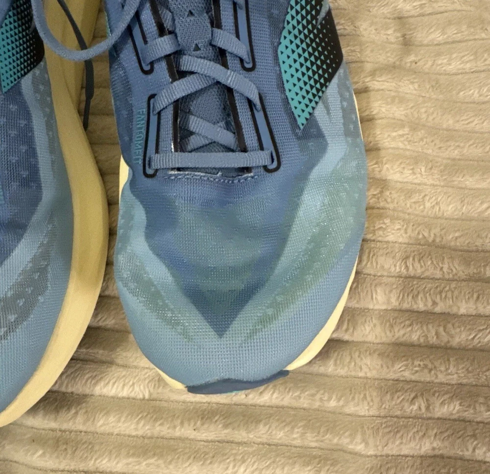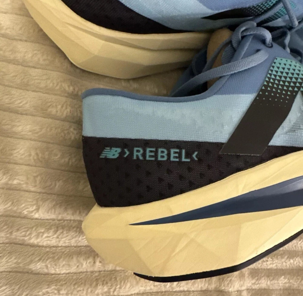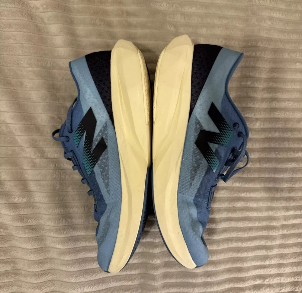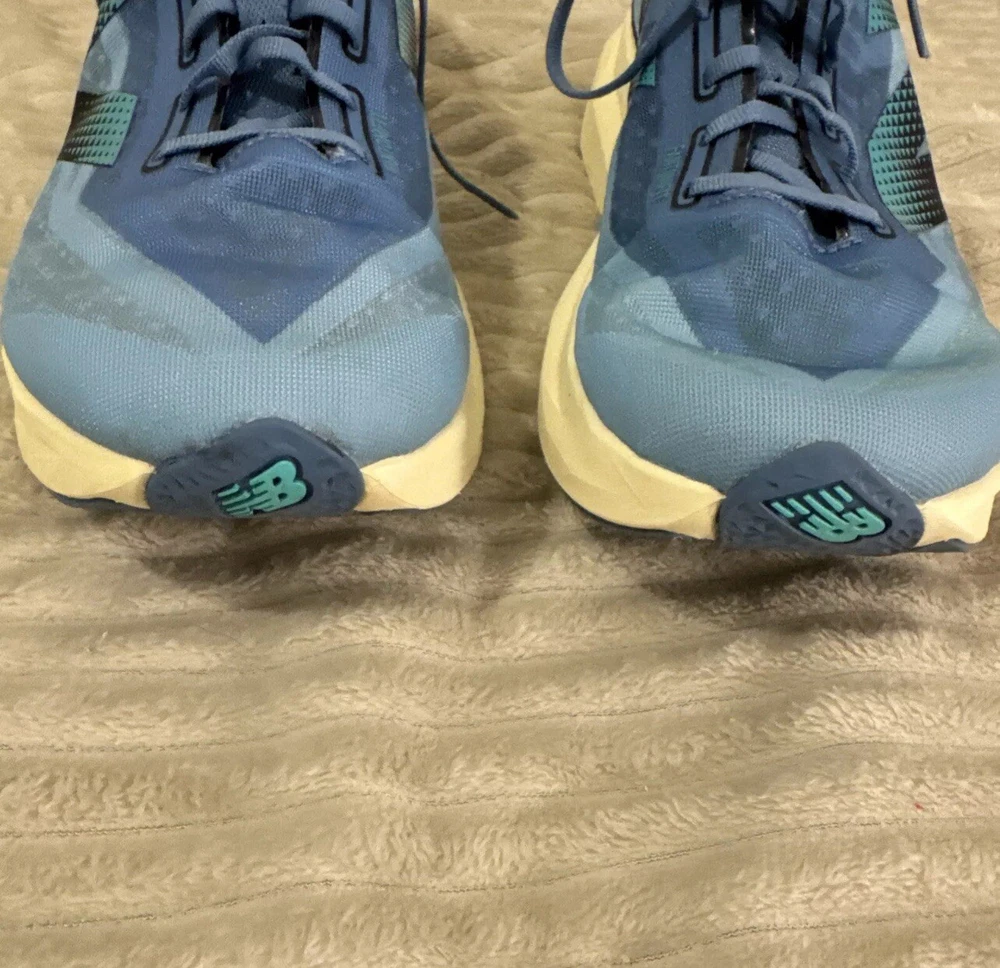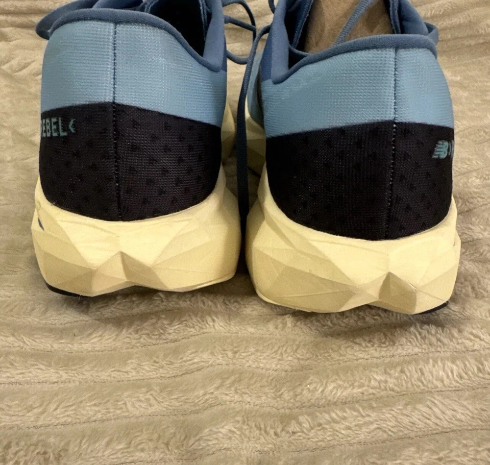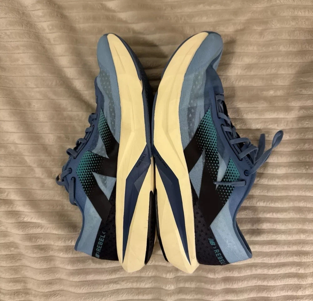This is a pre-owned pair of New Balance FuelCell Rebel v4 athletic running shoes, designed for men in a US size 15 wide (2E). The sneakers feature a mesh upper material for breathability and comfort during uptempo daily training and running. The New Balance FuelCell technology provides responsive cushioning and energy return for a comfortable and supportive running experience. Perfect for those looking for a quality pair of athletic shoes in a larger size.