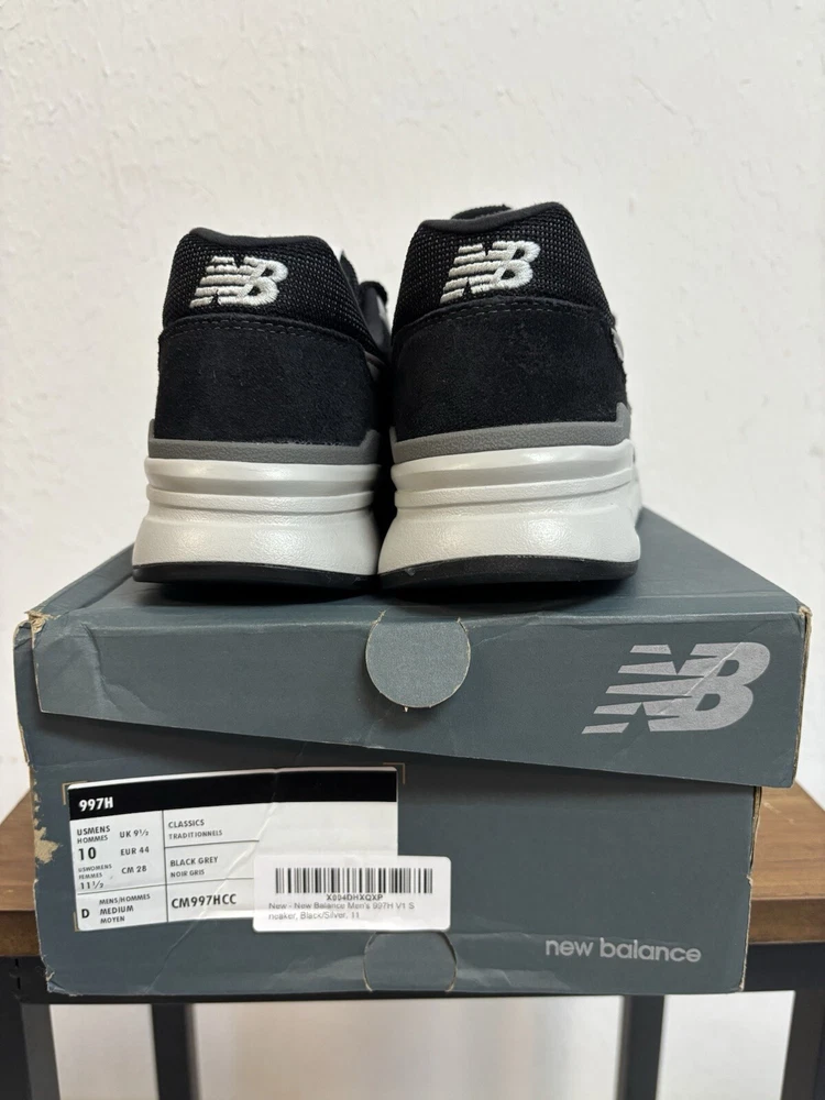 New Balance Men's 997H Sneakers in Black/Grey, size 10, were manufactured in 2018. These lace-up sneakers feature a colorblock design with a low-top shoe shaft style. They are cushioned, comfortable, and breathable, suitable for various occasions like activewear, casual, and workwear. The shoes are part of the New Balance 900 Series, ideal for gym training, walking, running, and other fitness activities.