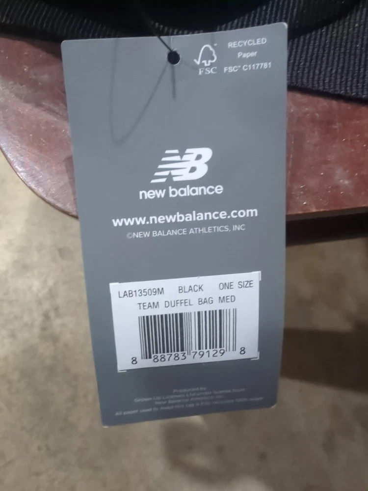 This is a New Balance Team Duffel Bag in medium size, featuring a solid black color with an angel character design. It has a zip closure, adjustable strap, and is made of polyester and nylon materials. The bag is lightweight and suitable for travel, casual, formal, workwear, or business occasions. It has a fabric lining and measures 24 inches in width, 12 inches in height, and 8 inches in depth.