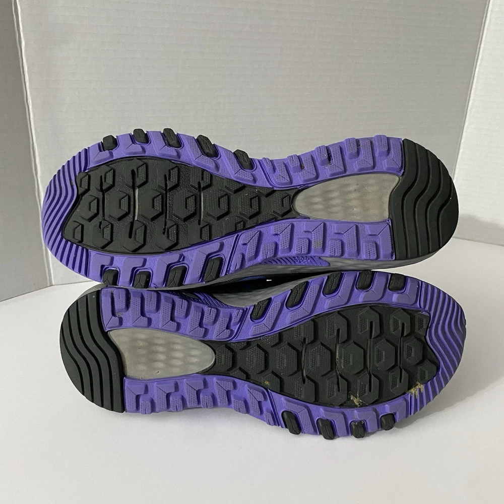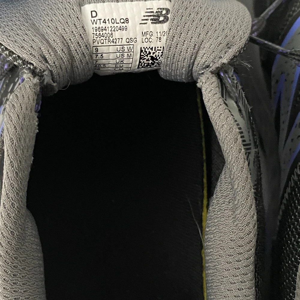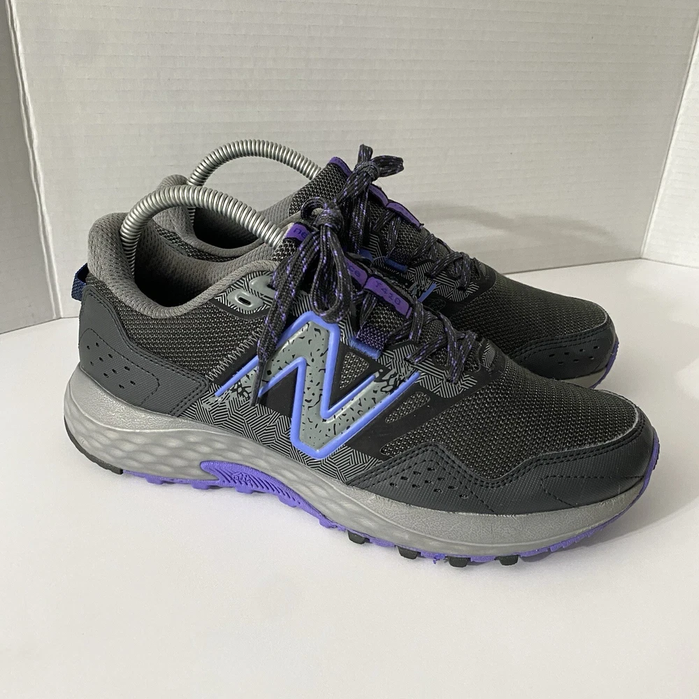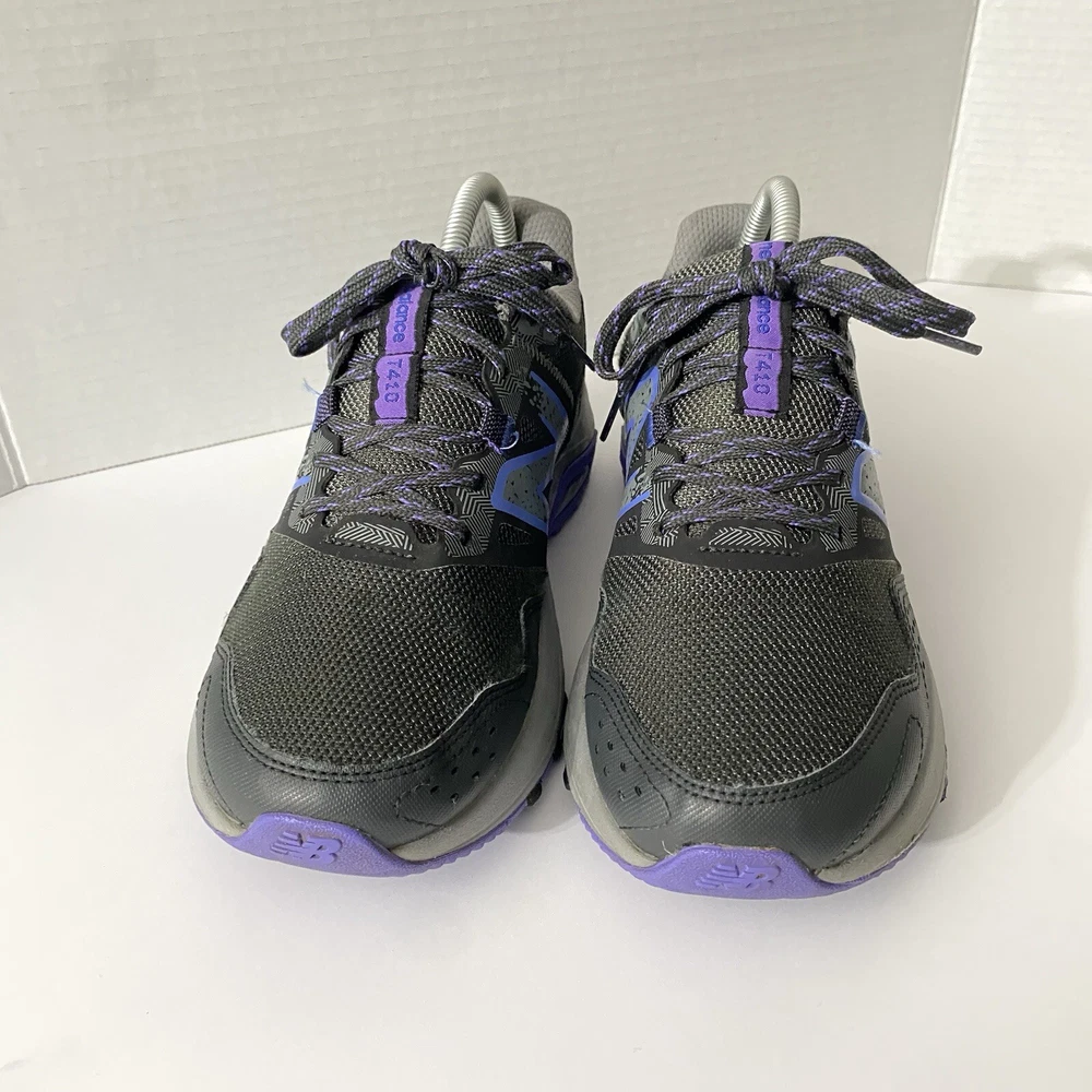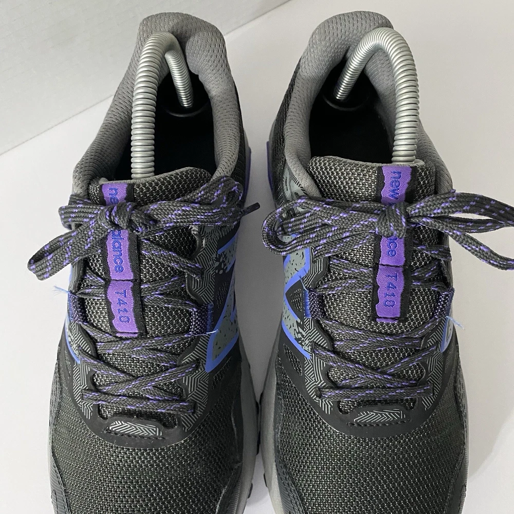New Balance Women's 410 V8 Trail Running Shoe in Shadow Grey/Electric Indigo, size 9. This lace-up sneaker features a fabric, mesh, and synthetic upper with a rubber outsole. Ideal for activities like running, walking, and hiking, it offers comfort and support with a foam insole. The design includes colorful accents and a solid pattern, making it a stylish choice for outdoor sports in any season. In used condition has lots of life left