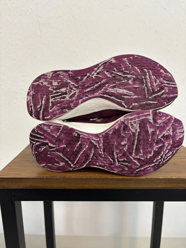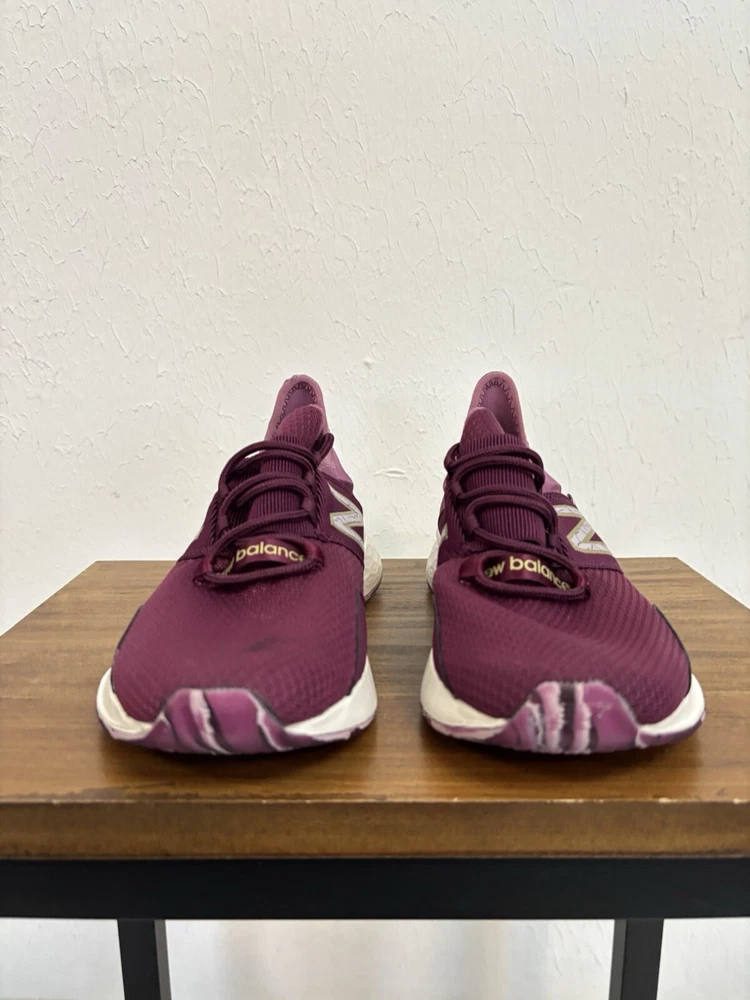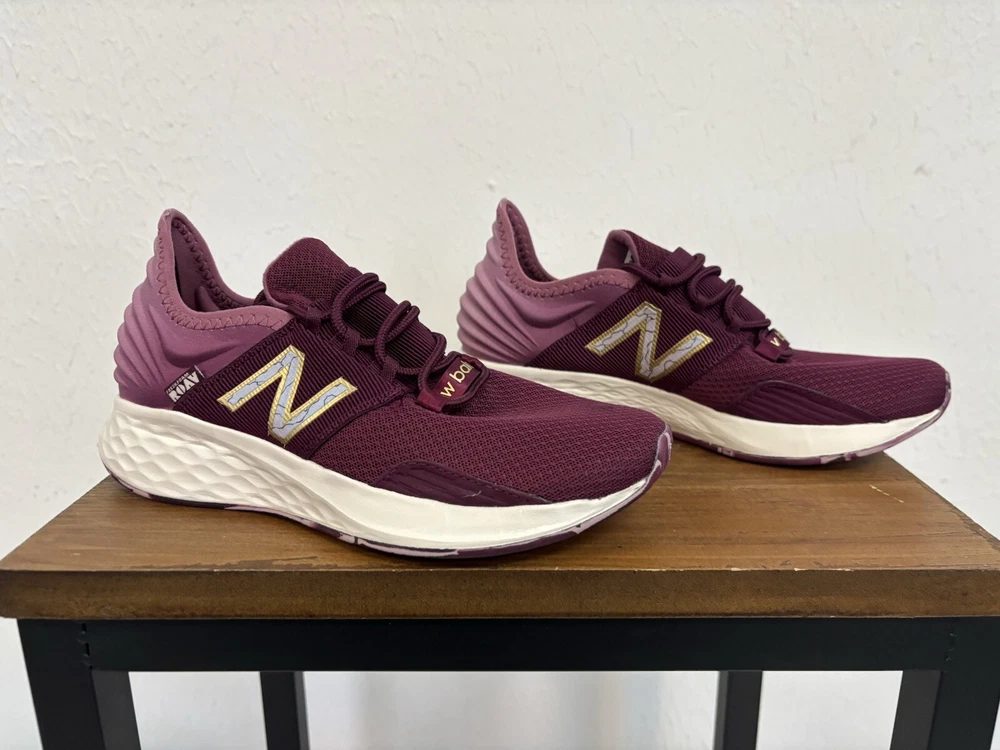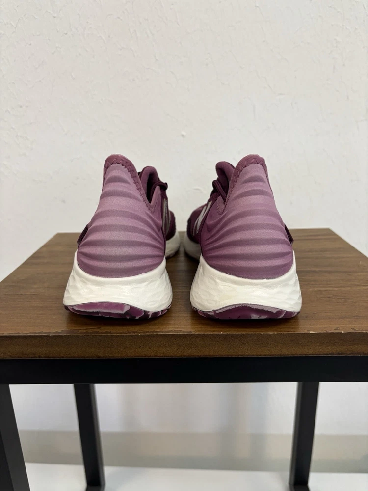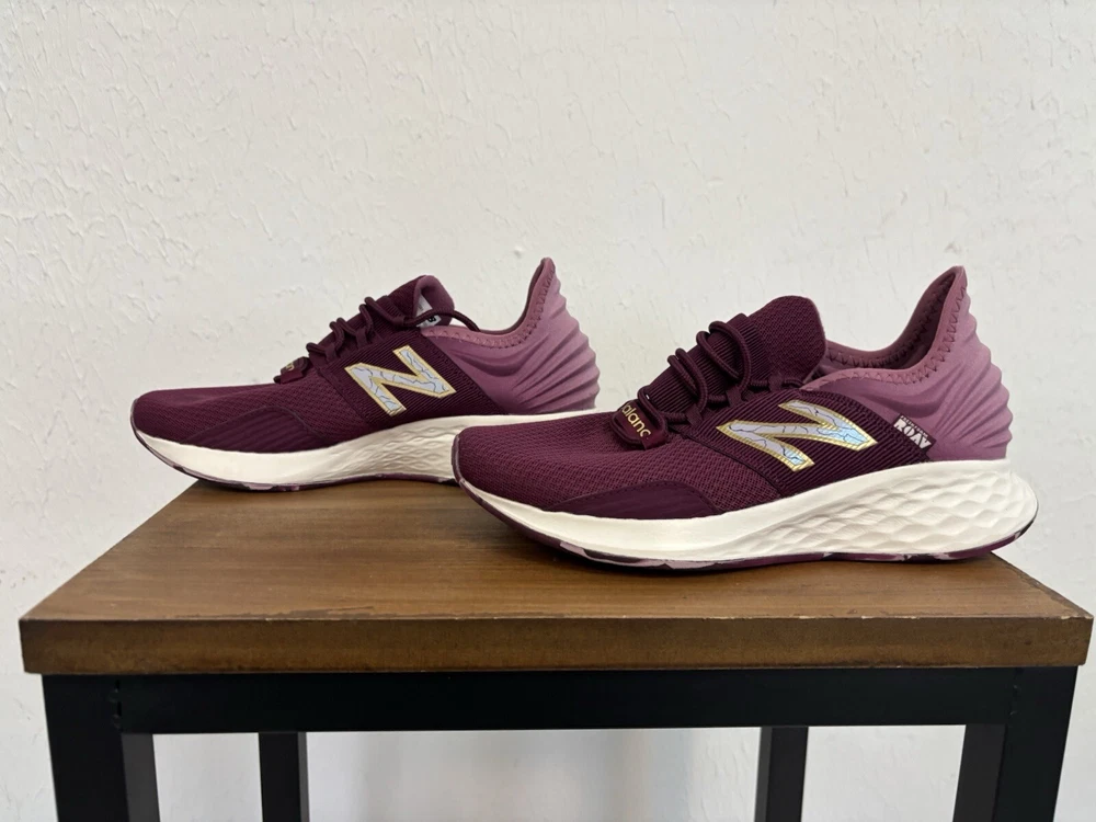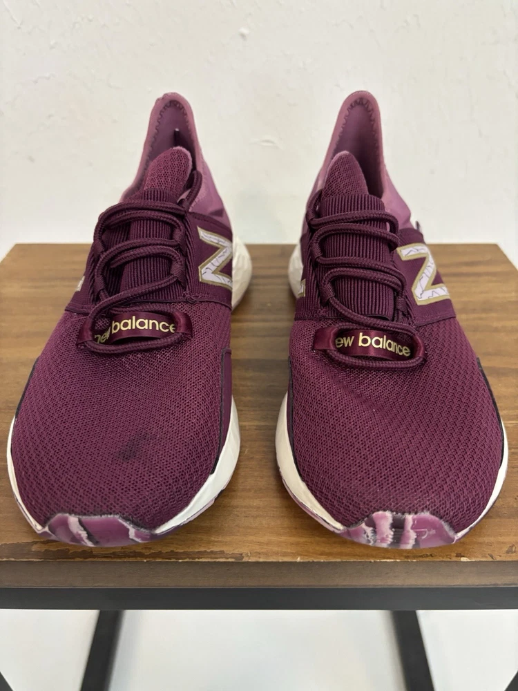 This product is a pair of New Balance women's athletic shoes in a pink color. The shoes feature a lace-up closure and a Fresh Foam insole for comfort. They are in size 6.5 and have a sneaker style. The model number is WROAVQD1, and they are brand new. Shoes are new with a small stain on the top of left shoe as shown in the pictures. No original box.