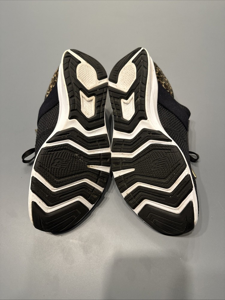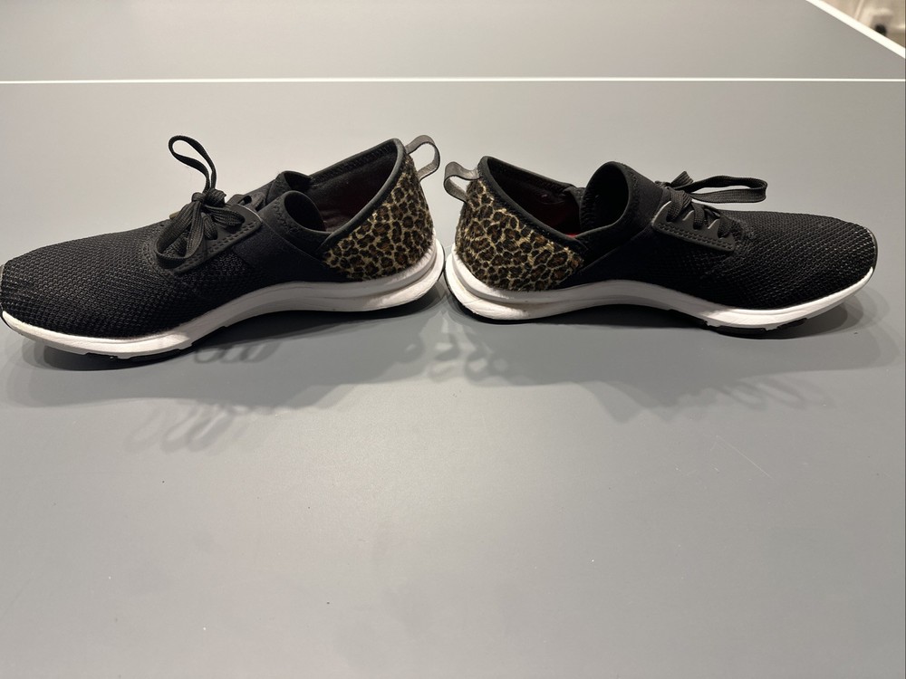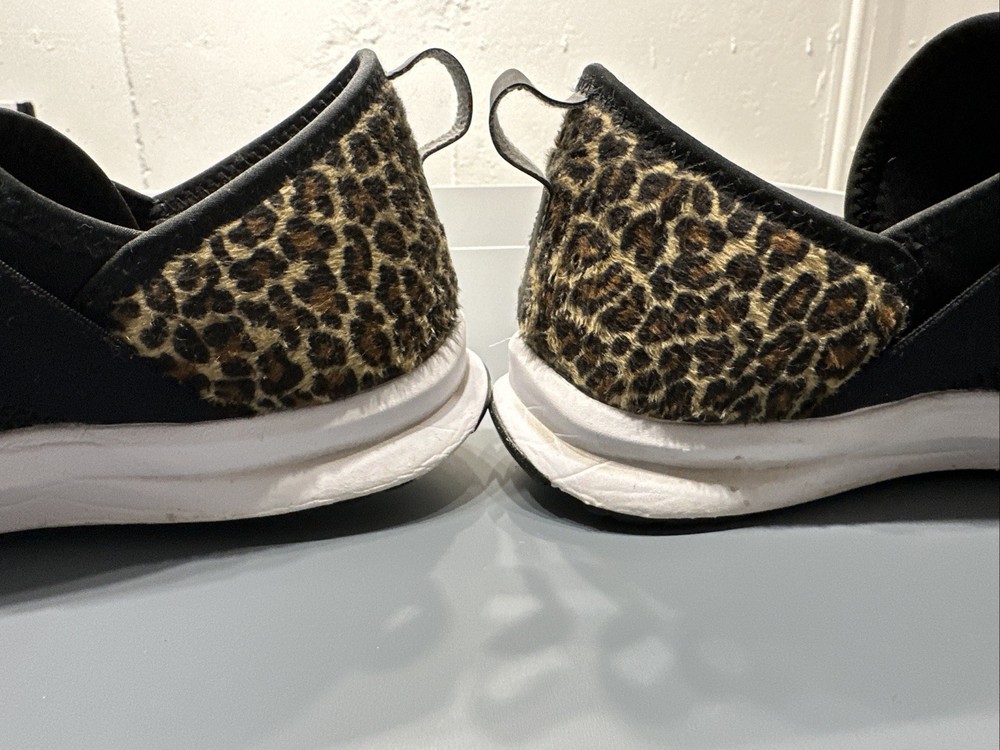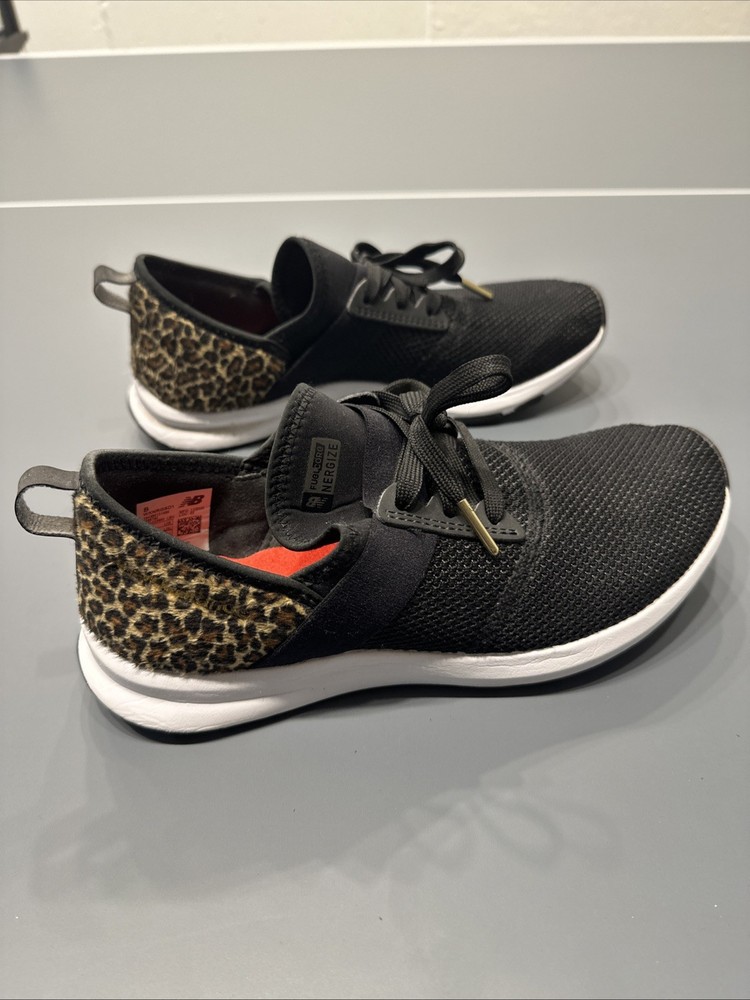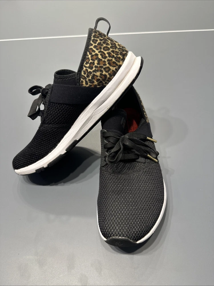The product is a pair of New Balance Women's Black and Leopard Print Sneakers in size 8.5. These athletic shoes feature a low top design with a lace-up closure for a secure fit. The rubber outsole provides traction, making them suitable for casual occasions and running activities. The black upper with leopard print accents adds a stylish touch to the sneakers, while the foam insole ensures comfort. Perfect for summer, fall, and spring seasons, these sneakers are a trendy and functional addition to any woman's wardrobe.
