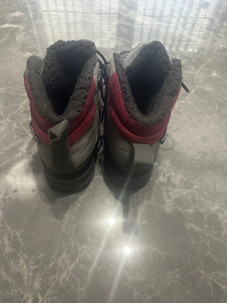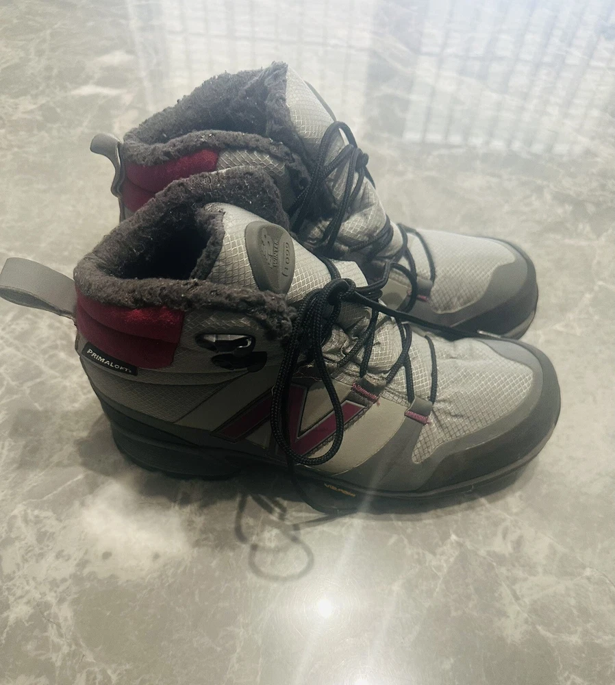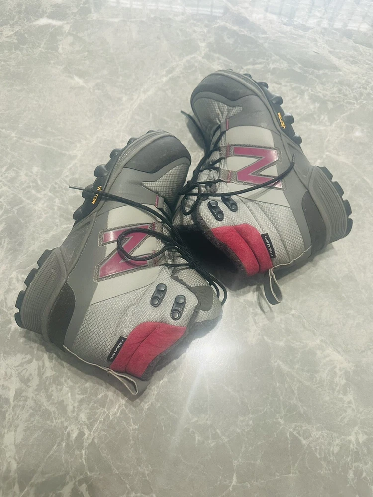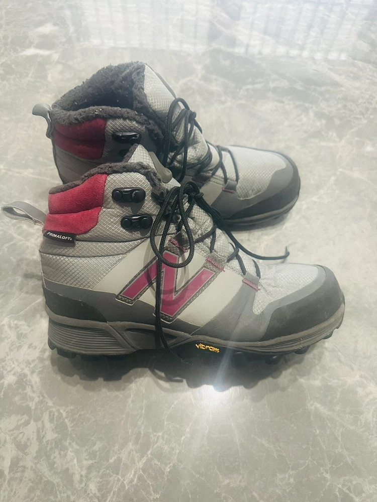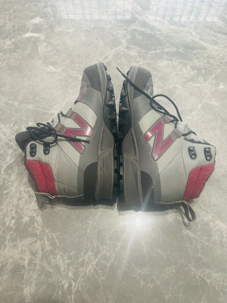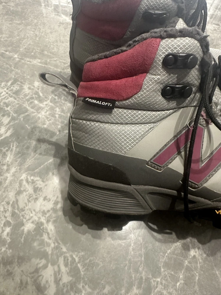 These New Balance Women's Hiking Boots are designed for winter wear, featuring a waterproof cotton blend upper material in a stylish gray color with pink accents. The boots have a round toe shape and lace-up closure for a secure fit, with a faux fur lining for added warmth and comfort. With a flat heel style and Primaloft insulation, these boots are suitable for outdoor activities like hiking and travel, as well as casual everyday wear. Available in US size 8.5, these boots offer both style and functionality for the colder months.