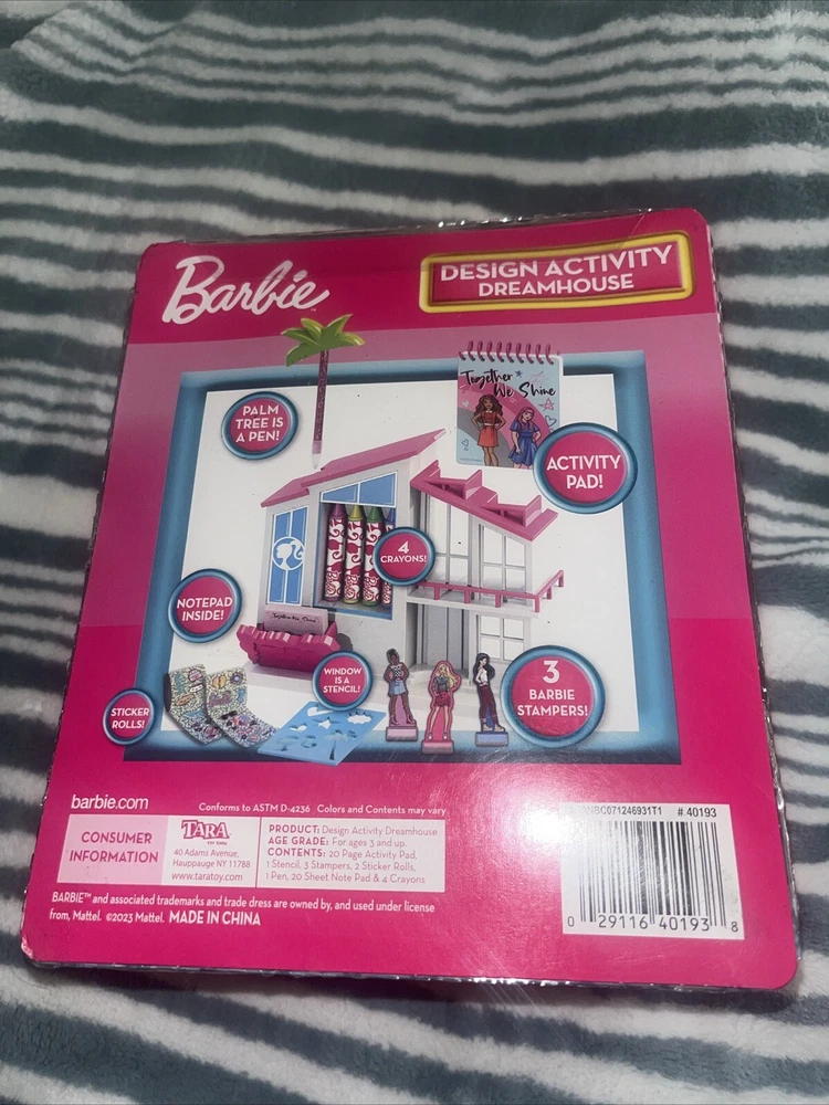 This is a new Barbie Design Activity Dream House set by Mattel, manufactured in 2022. The set includes an activity pad, stencil, stampers, and pen. It is part of the Barbie Activities product line and is designed for all occasions. The doll included is a girl doll with varying hair types and complexions. The set also includes stamps, stickers, and is suitable for ages 3 and up.