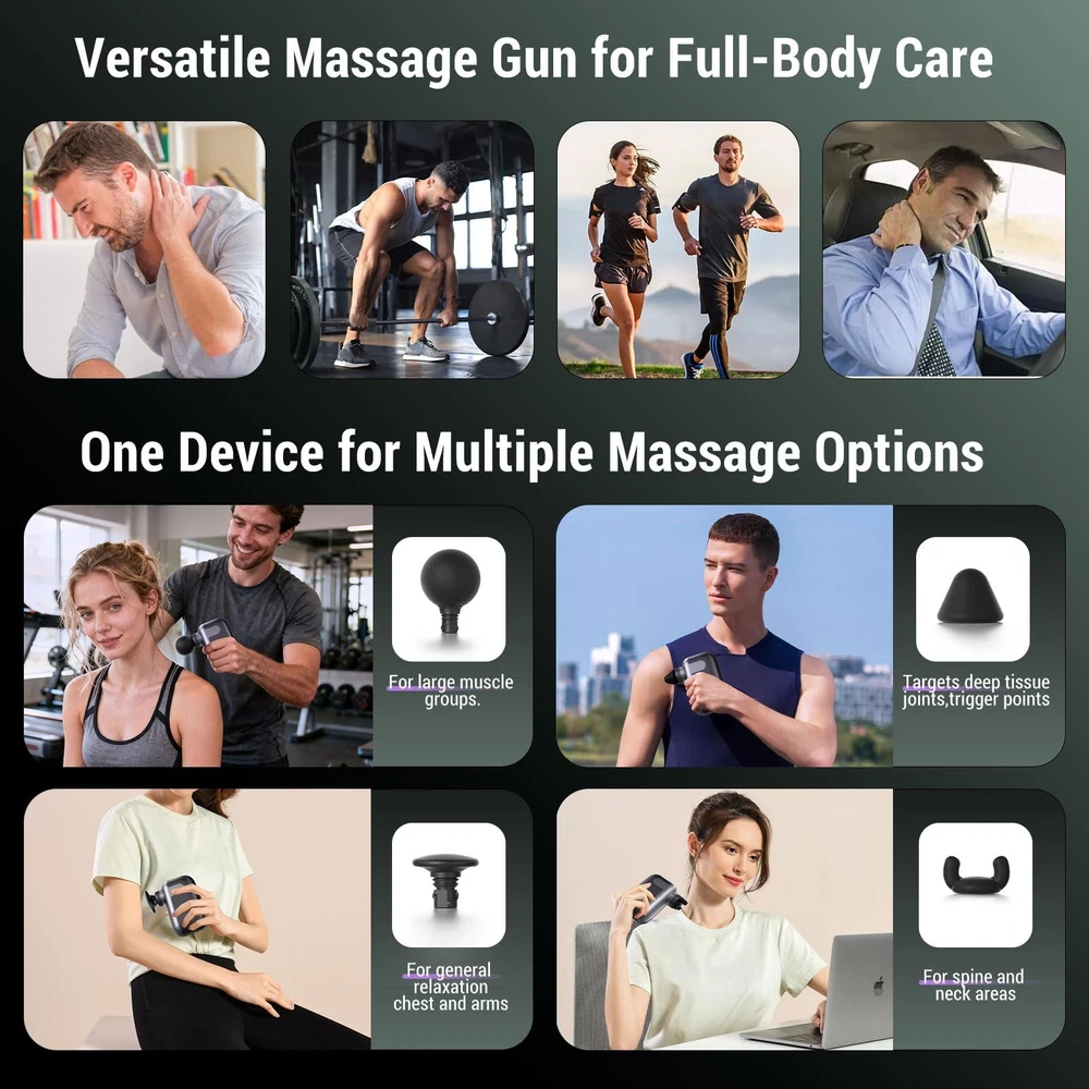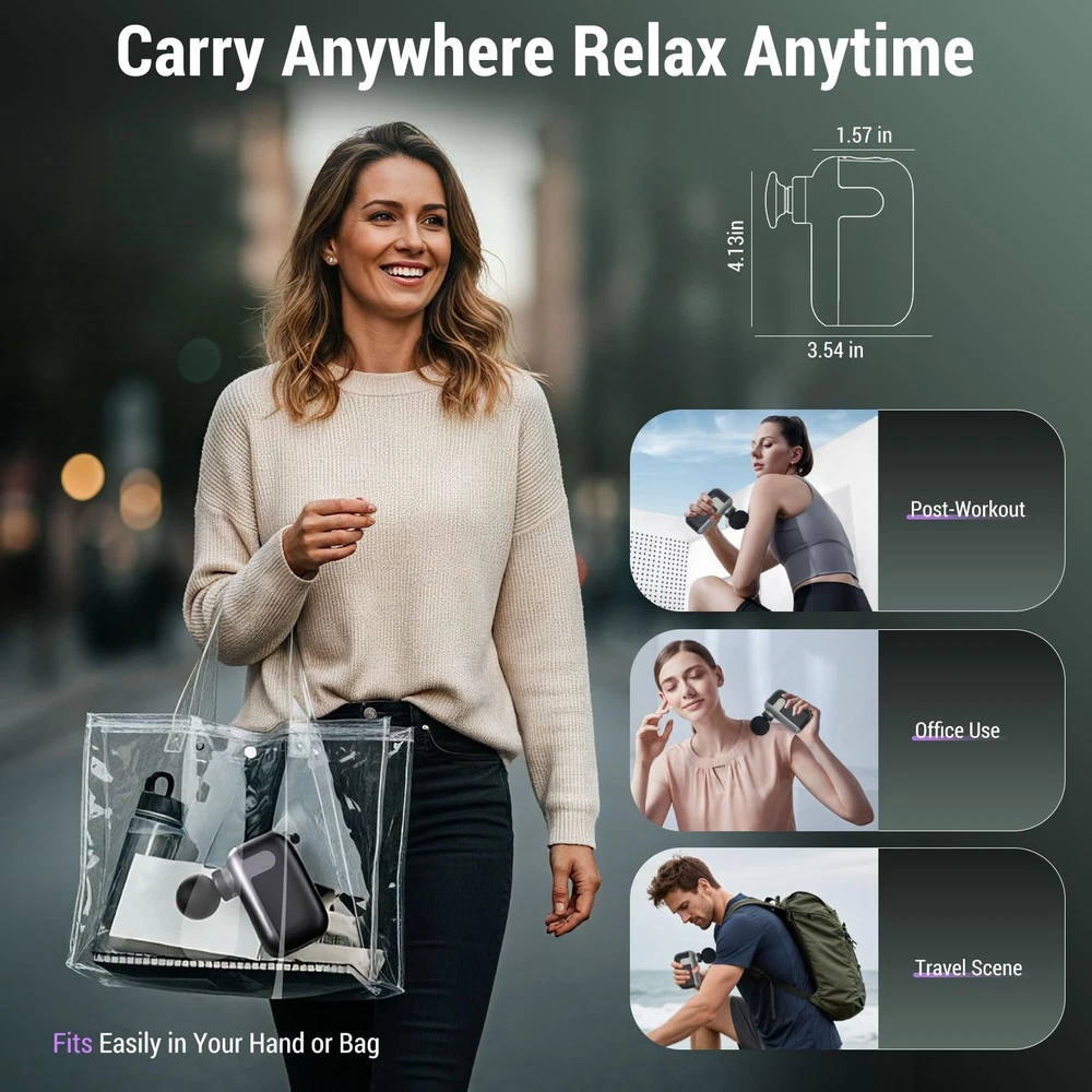 Professional Muscle Relief Anytime Experience deep tissue relaxation with this compact, handheld massage gun. Equipped with a high-torque brushless motor and 5 adjustable speeds (1600–3100 RPM) with 8mm amplitude, it effectively loosens tight muscles,soothes tired muscles, and supports post-workout recovery. Running under 45dB, it ensures quiet, comfortable sessions while delivering consistent power. Customizable Massage Experience Featuring 9 interchangeable massage heads, this percussion gun allows you to target neck, shoulders, back, arms, legs, and feet. Switch easily between gentle and deep tissue massage for tailored intensity, ensuring a fully personalized massage experience. The ergonomic design ensures comfort even during extended use. Portable & Travel-Ready Weighing just 0.5 lb and measuring 4.13 x 3.54 x 1.57 inches, this mini massage gun is ultra-compact and perfect for on-the-go relief. Slip it into your gym bag, backpack, or suitcase to relieve tension anytime—after workouts, long hours at a desk, or while traveling. Long-Lasting Power Equipped with a 3C Power Battery, enjoy up to 5–7 hours of continuous use on a single charge. Fast Type-C charging fully recharges the device in just 3.5 hours. The built-in 10-minute auto-off prevents overuse and protects your muscles and skin while preserving battery life, ensuring safe and reliable performance every time. Ideal Gift & Support Sleek, portable, and powerful, this mini percussion massage gun makes a thoughtful gift for birthdays, holidays, or special occasions. Backed by a 5-year and responsive 24-hour customer support, it offers peace of mind, long-lasting comfort, and a premium wellness experience for friends, family, or yourself. Perfect for: gym enthusiasts, athletes, office workers, travelers, seniors, and anyone seeking fast, convenient, professional muscle relaxation at home or on the go. 【Advanced Brushless Motor】This compact massage gun features a high-torque brushless motor with 5 adjustable speeds (1600–3100 RPM) and an 8mm amplitude to help relax tight muscles and support post-workout recovery. Running under 45dB, it offers a quiet, comfortable experience with steady power. The ventless thermal management system prevents overheating without external vents, enabling longer sessions with consistent performance and greater motor durability. 【Personalized Massage System】This percussion massage gun features 9 interchangeable heads and adjustable speeds, allowing you to customize each session. Target neck, shoulders, back, arms, legs, and feet with precision. Switch easily between gentle relaxation and deep tissue massage, with tailored intensity to loosen tight muscles and support muscle recovery. Its ergonomic design ensures comfortable handling for longer sessions, delivering a fully personalized percussion massage experience. 【Ultimate On-The-Go Relief】Take your massage anywhere with this pocket-sized mini massage gun! Weighing just 0.5 lb and measuring 4.13x3.54x1.57 inches, it’s perfect for fitness enthusiasts, busy professionals, students, or travelers. Ideal for easing tight muscles after workouts, long hours at a desk, or during travel and study breaks. Its ultra-compact design fits in your gym bag, backpack, or suitcase, delivering fast, convenient relief anytime, anywhere. 【Long-Lasting Power】 Equipped with a 3C Power Battery, this cordless mini massage gun delivers strong, reliable performance for up to 5–7 hours of continuous use, so you can enjoy extended massage sessions without frequent recharging. Fast Type-C charging powers it up in just 3.5 hours. The built-in 10-minute auto-off protects your muscles and skin from overuse while preserving battery life, ensuring safe, efficient, and consistent performance every time. 【Gift With Assurance】Delight your loved ones with the perfect blend of style, power, and portability. This mini percussion massage gun offers professional muscle relaxation in a sleek, gift-ready package—perfect for birthdays, holidays, or special occasions. Compact and portable, it fits effortlessly into any lifestyle while delivering fast, effective relief. Backed by a 5-year and responsive 24-hour customer support, it’s a gift that brings lasting comfort, convenience, and confidence.