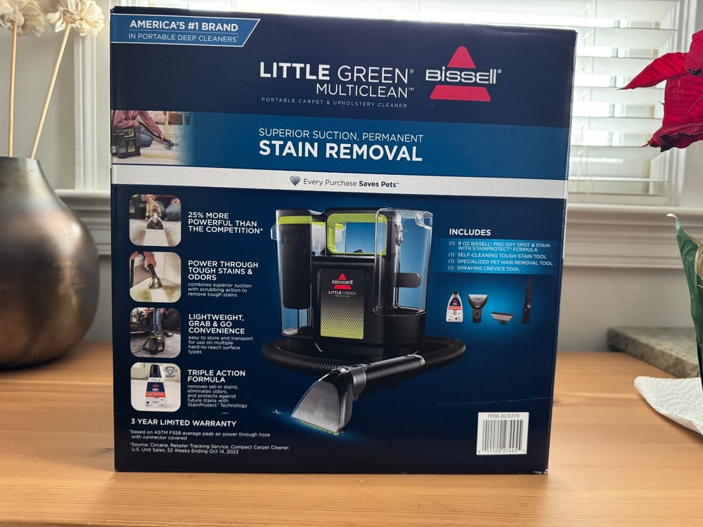 Brand new factory sealed package. Superior Suction: 25% More Powerful Than the Bissell Competition Instant & Permanent Pet Stain Removal with Pet Pro Oxy Spot & Stain Formula Self-Cleaning Tough Stain Tool Helps to Rinse Out Residue, Dirt and Debris Easy to Use: Longer Hose and Cord Let You Easily Clean Hard-to-Reach Messes Spray, Scrub and Suction: Triple Action™ Cleaning Removes Tough Pet Messes The BISSELL Little Green MultiClean Portable Carpet & Upholstery Cleaner is a compact vacuum perfect for quick and easy cleaning jobs. The 32 oz capacity is ideal for tackling small spills and stains, while the included accessories like the - Pet Hair Removal Tool - Upholstery Brush - Crevice Tool These tools make it versatile for cleaning various surfaces. With its corded power source and lightweight design, this cleaner is easy to maneuver and store, making it a convenient addition to any household. Designed by BISSELL, a trusted brand in home cleaning, this portable cleaner is sure to deliver reliable performance.