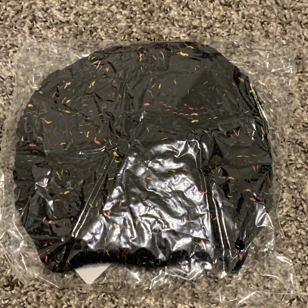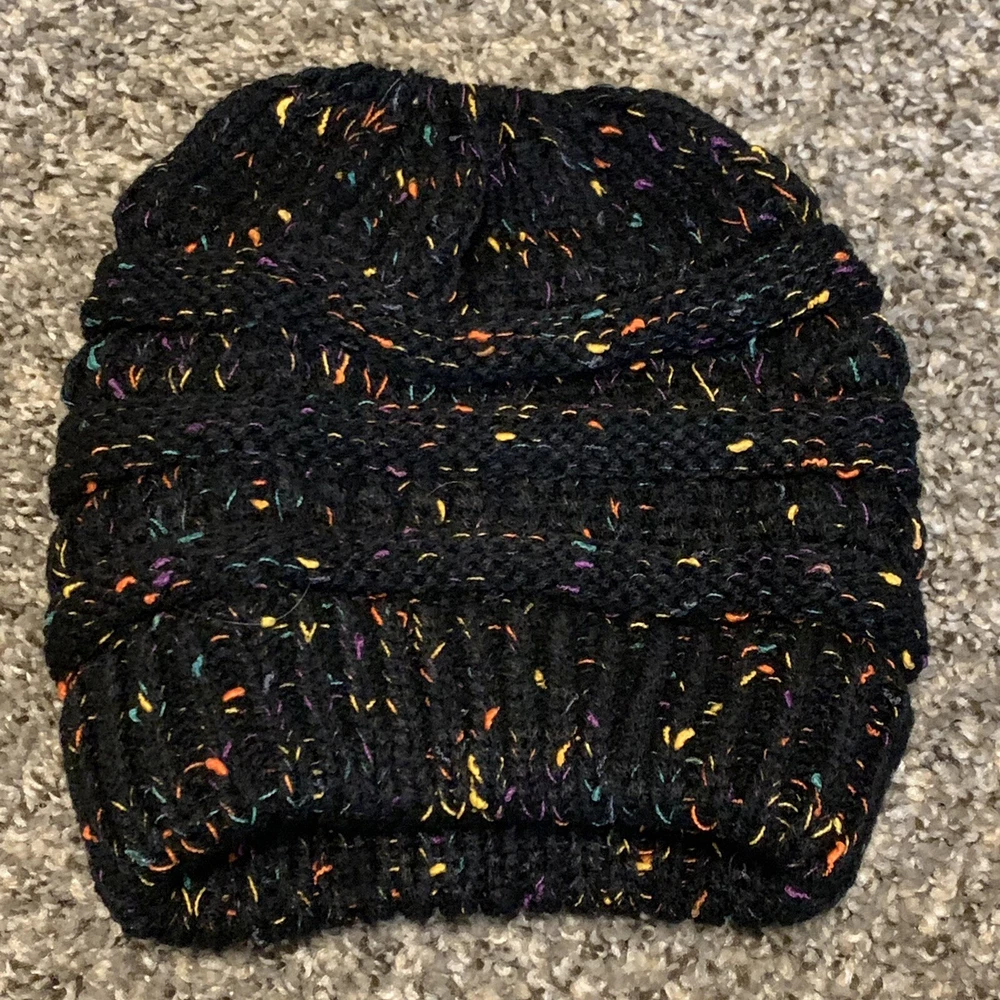 New Black Confetti Beanietail Ponytail Messy Bun Ribbed Beanie Hat Cap Elastic. Super thick and warm Black and colorful “confetti” colored acrylic yarn goes with multiple outfits Ribbed design fits snug and comfortably Elastic band where ponytail comes through