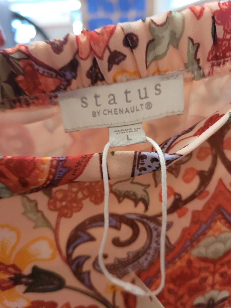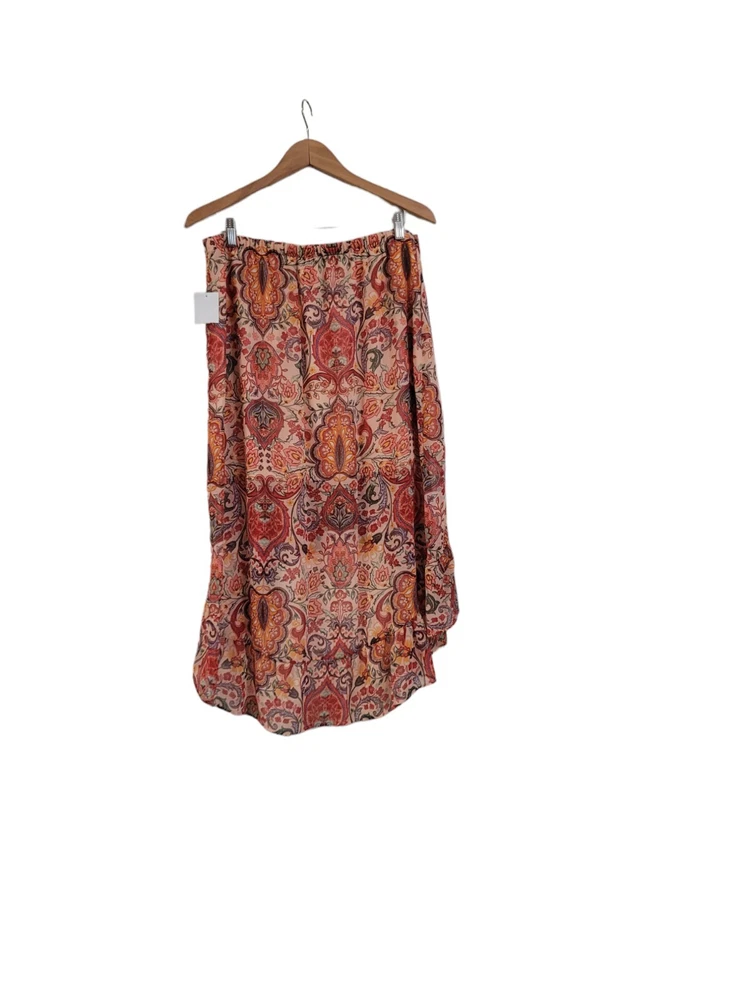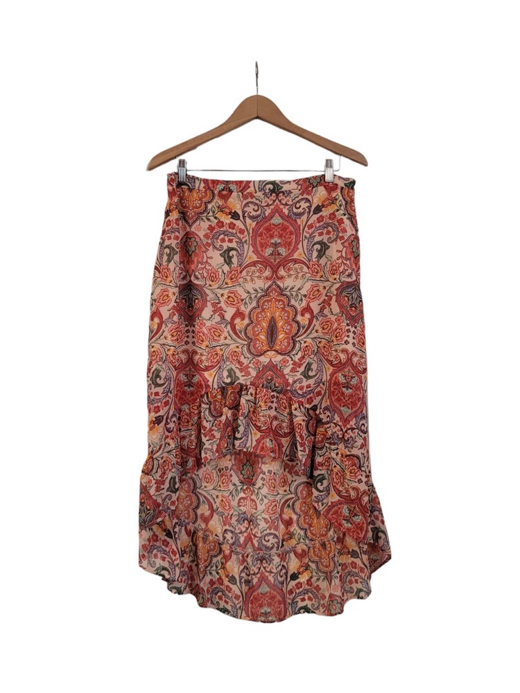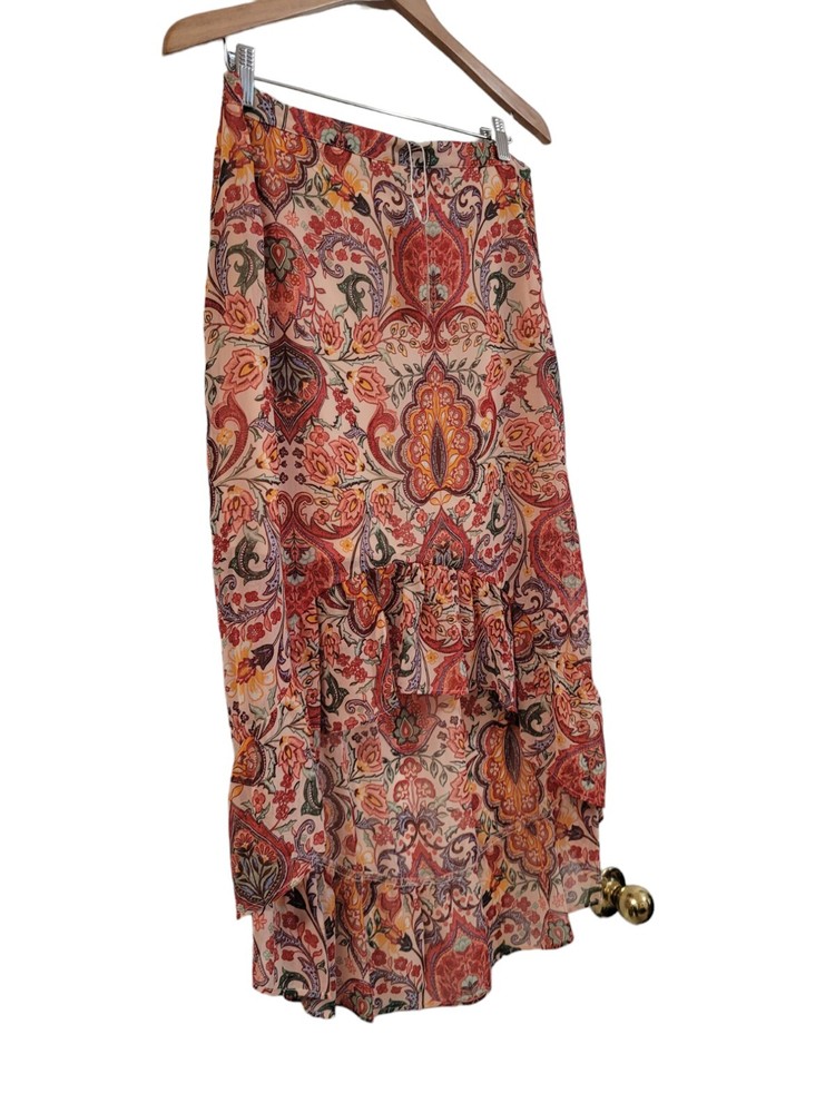 New Status By Chenault Rust Boho Floral Print Chiffon Ruffle High Low Midi Skirt Large L. Elastic Back Waist, Lined , Lightweight, All Seasons , Pull-on. Length Back 36 in Front 22 in , Waist 32 in . Same Day Shipping/ Next Day