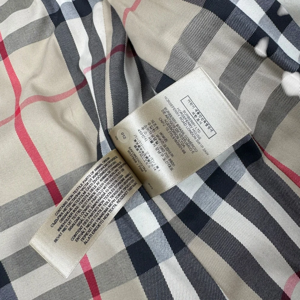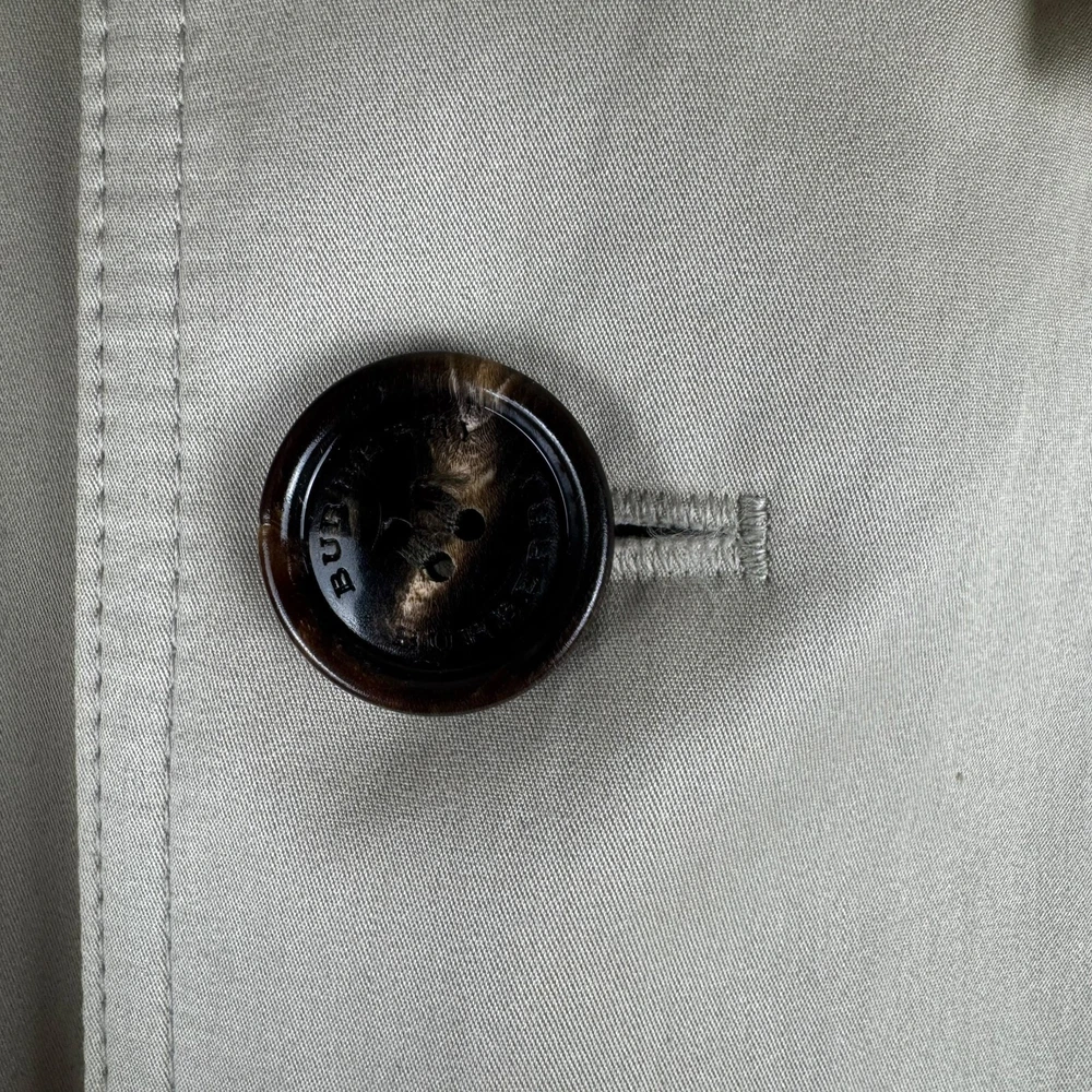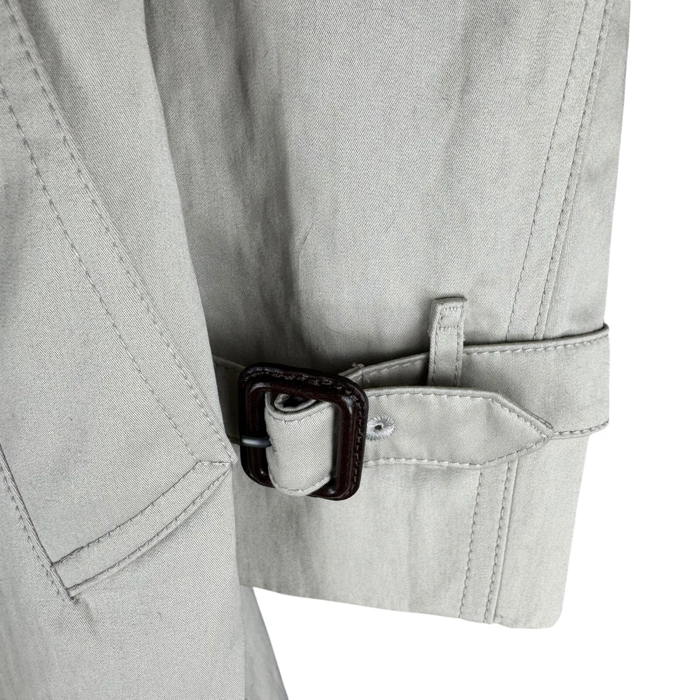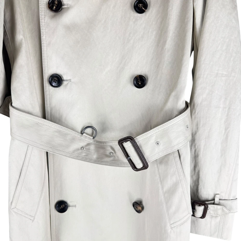 Exposed button fastenings at front collar Buttoned epaulette at shoulders Buckle-fastened tab at cuffs Double-breasted Storm flap Detachable buckle belt at waist Two pockets at front Branded buttons Single vent at back hem Fully nova check lined Brand New With Tags Retails: $2,650 Color: Stone Condition: New With Tags Material:67% Cotton 23% Polyamide Measurements: Pit to Pit: 17.25" Garment length: 37.5" Sleeve length: 23" Shoulder to shoulder: 15"