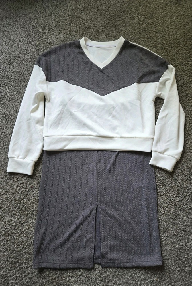 This new charcoal and ivory sweater with a sweater midi pencil skirt set is a stylish and versatile outfit for ladies in size medium. The pullover sweater features a v-neckline and long sleeves, perfect for casual, workwear, or business occasions. Made from polyester knit fabric, the 2-piece set includes a pleated skirt and a classic cable pattern sweater, offering comfort and a regular fit for the winter, fall, and spring seasons. Easy to care for with machine washable instructions, this outfit is a timeless addition to any woman's wardrobe. New without tags