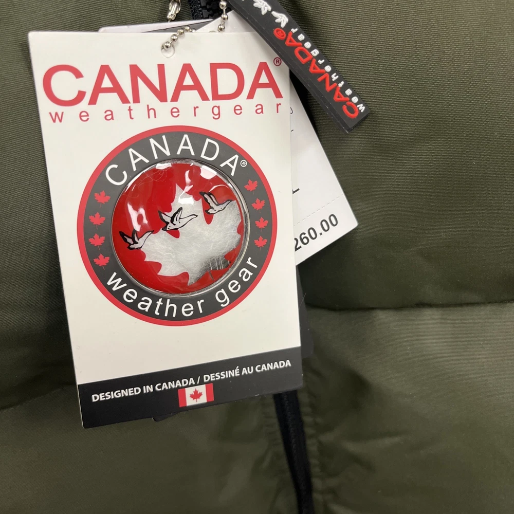 The product is a new Canada Weather Gear men's size L dark green puffer jacket made from polyester. It is designed for regular fit and features weather gear technology to keep the wearer comfortable in various weather conditions. The stylish design and quality materials make it a great addition to any man's wardrobe, offering both functionality and a fashionable look. Featuring the brand's signature weather gear technology, this jacket is sure to keep you warm and stylish in cold and wet weather.