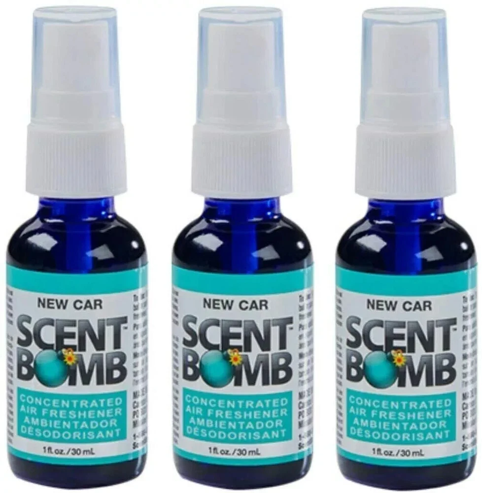 Scent Bomb 100% Oil Based Concentrated Air Freshener Spray, New Car, Pack of 3 Scent Bomb Air Freshener Spray, New Car 3 Bottle Product Info Scent Bomb air freshener spray refreshes your car, home, and anywhere you want to mask odor. Our air freshener spray is oil based, that is designed for its long lasting fragrance that will give you a fresh and calming ambience. This is intended to fill your home, car, or office with incredible scents that covers all types of odors and smells. Made in the USA. Just a few sprays and it will last for days! Features QUALITY FORMULA: Scent Bomb air freshener uses a scented oil-based formula that is created for long lasting fragrance that will give you a fresh and calming ambience. Just a few sprays and it will last for days! HOME AND CAR AIR FRESHENER: This air freshener spray is ideal to refresh your car, home, room, or office with incredible scents that eliminate all types of odor and smells! LUXURIOUS SCENTS: Scent Bomb air freshener will help you relieve stress, help you stay alert, and improve your mood. Remove odor and freshen your life that gives you a pleasant scent. PACKAGE CONTENT: Each pack contains New Car, 1 fl.oz. spray air freshener bottles. Great use for car freshener, room spray, bathroom spray, or spray for your gym bag! A great air freshener for home, work or on the go! TRUSTED BRAND: All Scent Bomb Air Fresheners are made in the USA and designed for its long lasting fragrance. A great air freshener spray for your car and home