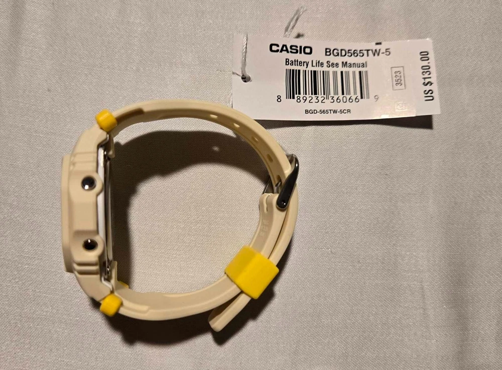 gtin13:889232360669Type:WristwatchModel:Casio Baby-GDepartment:WomenReference Number:BGD565TW5UPC:889232360669Display:DigitalFeatures:1/100-second stopwatch, Multi-function alarm, Hourly time signal, LED backlight (Super Illuminator), Full auto-calendar (to year 2099), 12/24-hour format, Countdown timer, Flash alertMovement:QuartzBrand:CasioBand Material:Resin