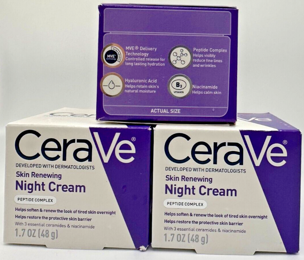 3X! NEW! IN BOX! CeraVe Skin Renewing Night Cream Peptide Complex 1.7oz./48g 🌟 Brand New Products! 🌟 Enjoy fast and free shipping within the US on all our items! If you have any questions or need assistance before making your purchase, please don’t hesitate to reach out. We’re here to help! 💬 Open to Offers! Looking to buy in quantity? We welcome offers on larger orders—just let us know your desired quantity and price! Thank you for considering our products! Happy shopping! Feel free to customize it further if you’d like!