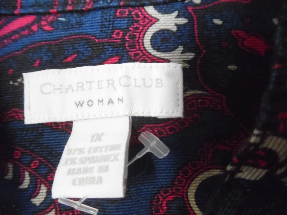 Size Type: Plus Type: Jacket Outer Shell Material: Cotton/Spandex Brand: Charter Club Color: Multi-Color Pattern: Paisley gtin13: 706255689716 Style: Basic Jacket Theme: Colorful UPC: 706255689716 Department: Women Size: 1X