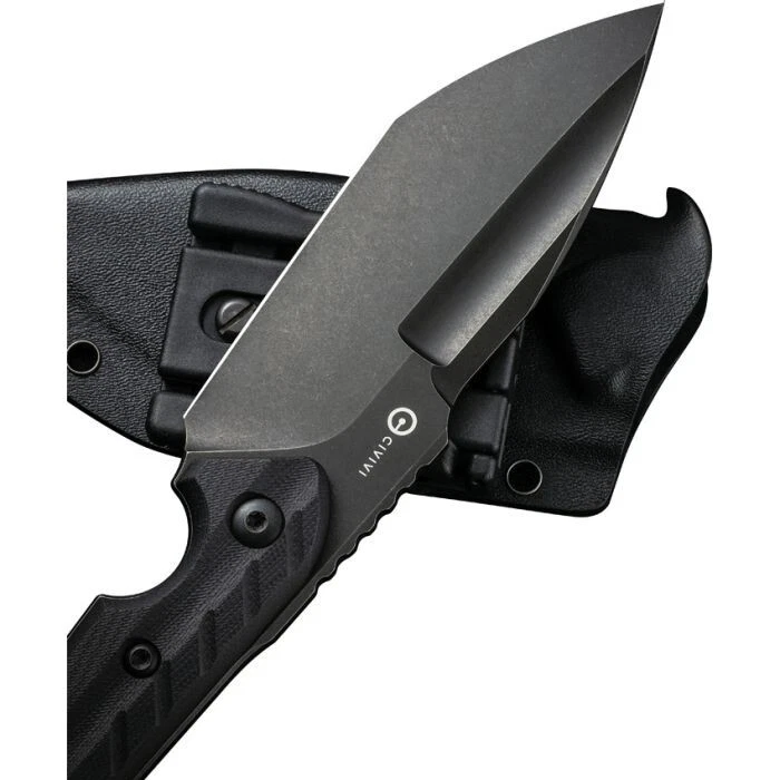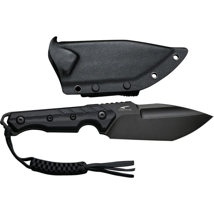 10.25" (26.04cm) overall. 4.75" (12.07cm) black stonewash finish D2 tool steel spear point blade. Black G10 handle. Full, extended tang. Lanyard hole. Bob Terzuola T-Clip. Braided paracord lanyard. Black Kydex belt sheath. Boxed