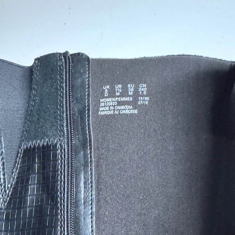 Closure: Zip Lining Material: Fabric Toe Shape: Round Toe Calf Width: Medium Heel Height: Mid (2-2.9 in) US Shoe Size: 7.5 Customized: No Color: Black Type: Boot Season: Fall, Winter Heel Style: Block Country/Region of Manufacture: Cambodia Product Line: Clarks collection Department: Women Accents: Zipper Vintage: No Style: Riding Boot Features: Adjustable, Comfort Upper Material: Leather/Suede Pattern: Solid Occasion: Business, Casual, Travel Personalize: No Brand: Clarks Shoe Shaft Style: Knee High Character: Boots Model: Clarks collection Shoe Width: M Insole Material: Soft cushion