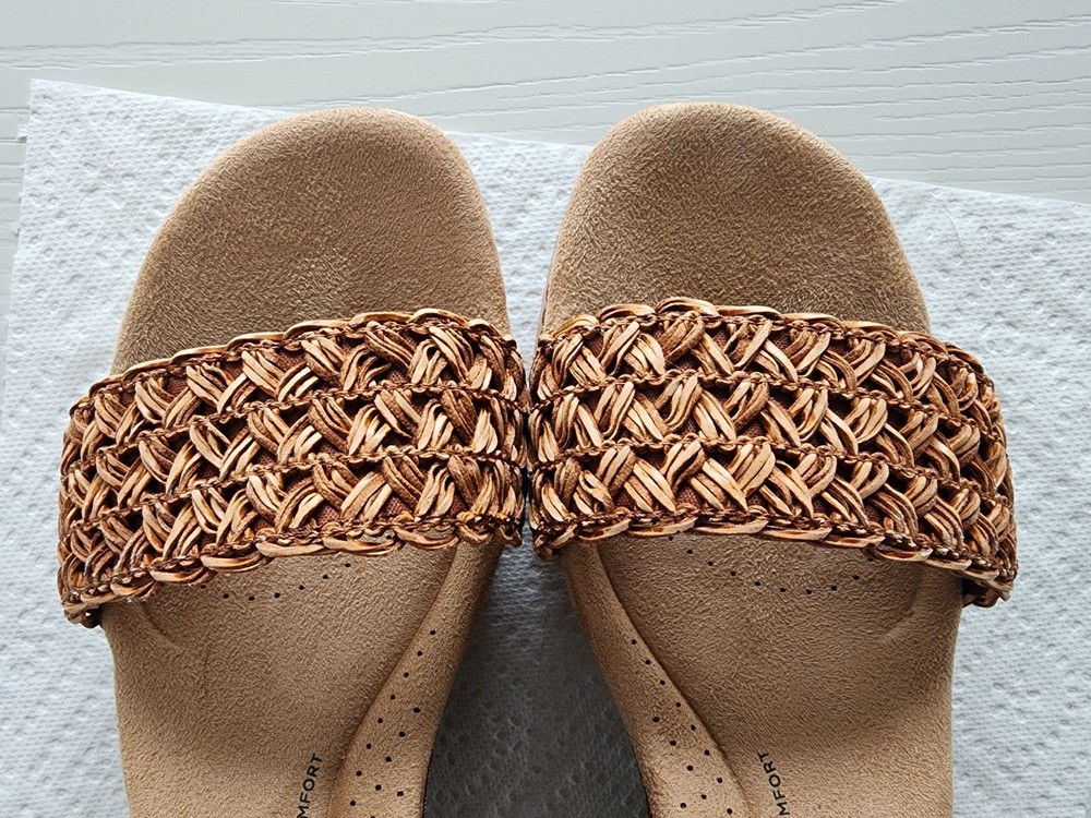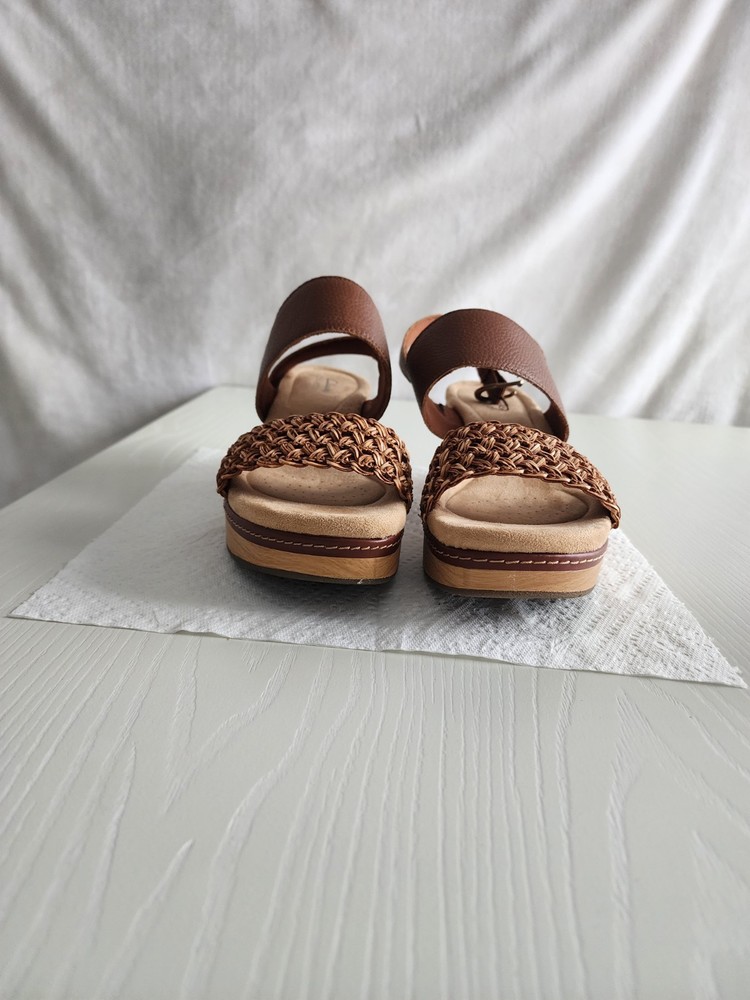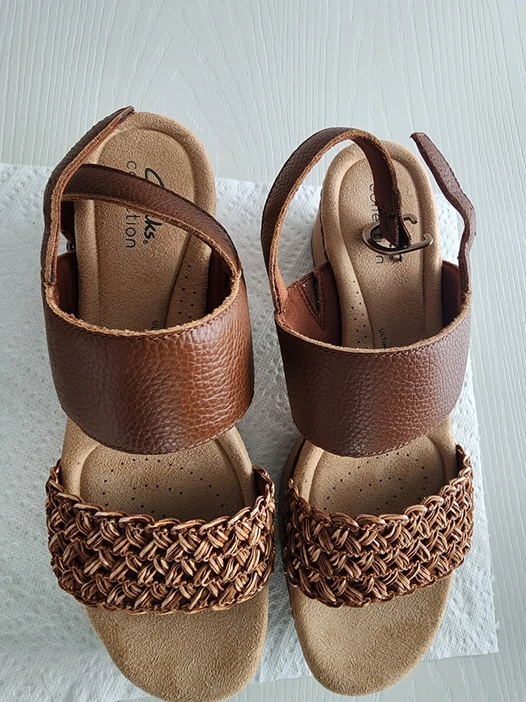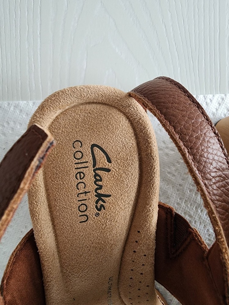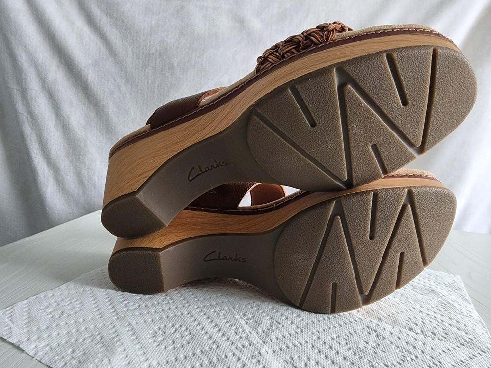Shoe Width: M Accents: Logo Customized: No Brand: Clarks Color: whiskey Features: Comfort Upper Material: Leather Type: Sandal Country of Origin: China Season: Spring, Summer Outsole Material: Rubber Pattern: Solid Department: Women Vintage: No US Shoe Size: 9.5 Style: Strappy Heel Height: Mid (2-2.9 in) Heel Style: Wedge Personalize: No Occasion: Casual