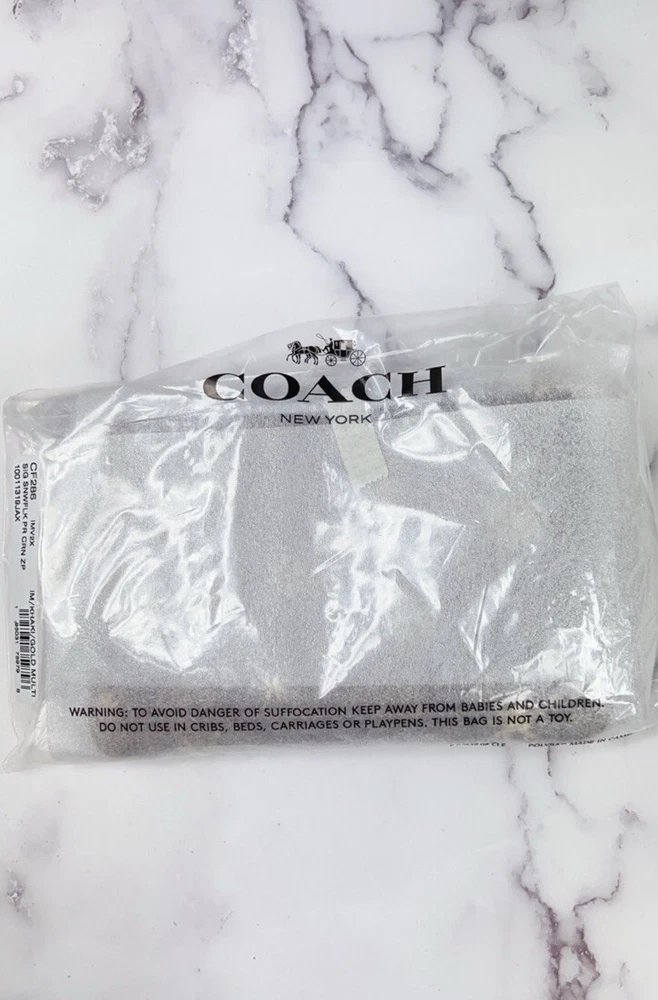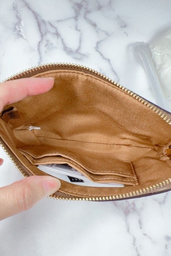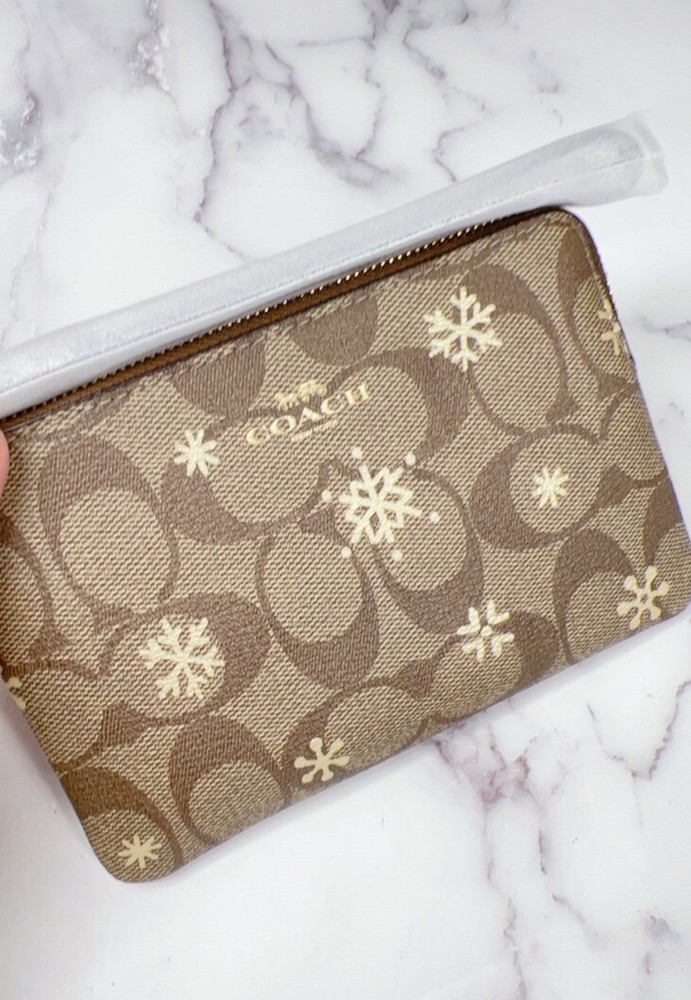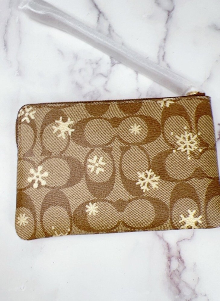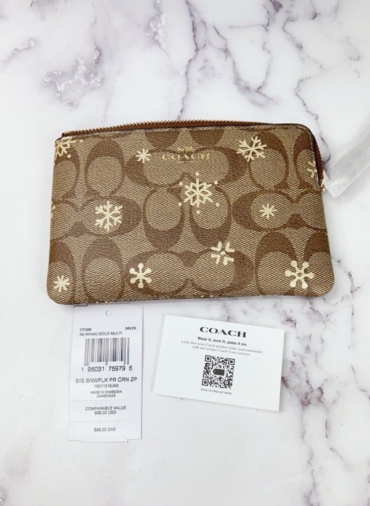 Price firm Free shipping New with original packaging CF286 Length: 6.25" Height: 4.0" Width: 0.5" Signature coated canvas and smooth leather Fabric lining Wrist strap attached Zip-top closure Two credit card slots Wrist strap attached