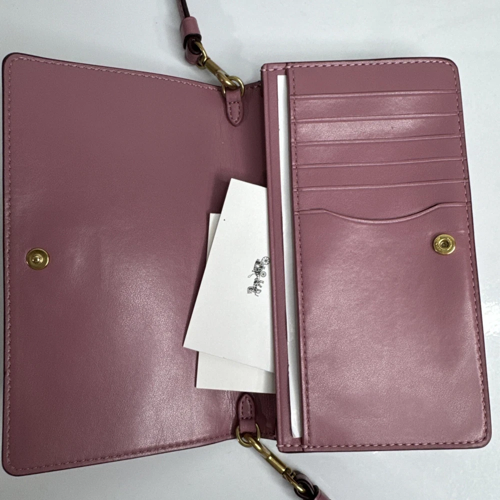This Coach Smooth Leather Slim Phone Crossbody Bag in Rose Pink Gold Brass is a must-have for any fashion-forward individual. With a sleek and stylish design, this bag is perfect for any occasion, whether it be a party, wedding, or casual outing. The bag features a snap closure and a crossbody strap with a 23-inch drop, making it easy to carry and versatile for everyday use. Crafted with high-quality leather, this bag boasts a smooth finish and a durable construction that will last for years to come. The bag's dimensions are 7 inches in width, 4 inches in height, and 1 inch in depth, making it the perfect size for carrying your essentials. The bag's interior is lined with leather and features credit card slots and a cross-body strap, making it functional and fashionable. This limited edition bag is part of the Coach Factory product line and is a great addition to any collection.