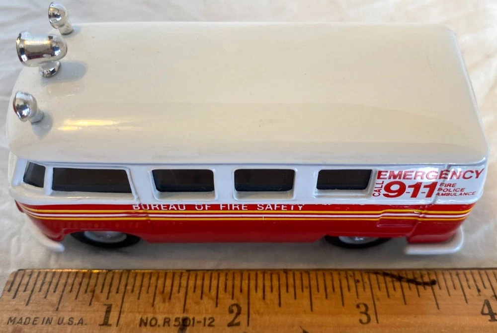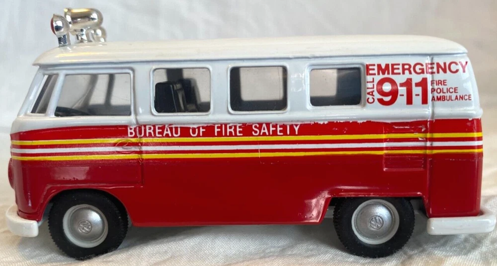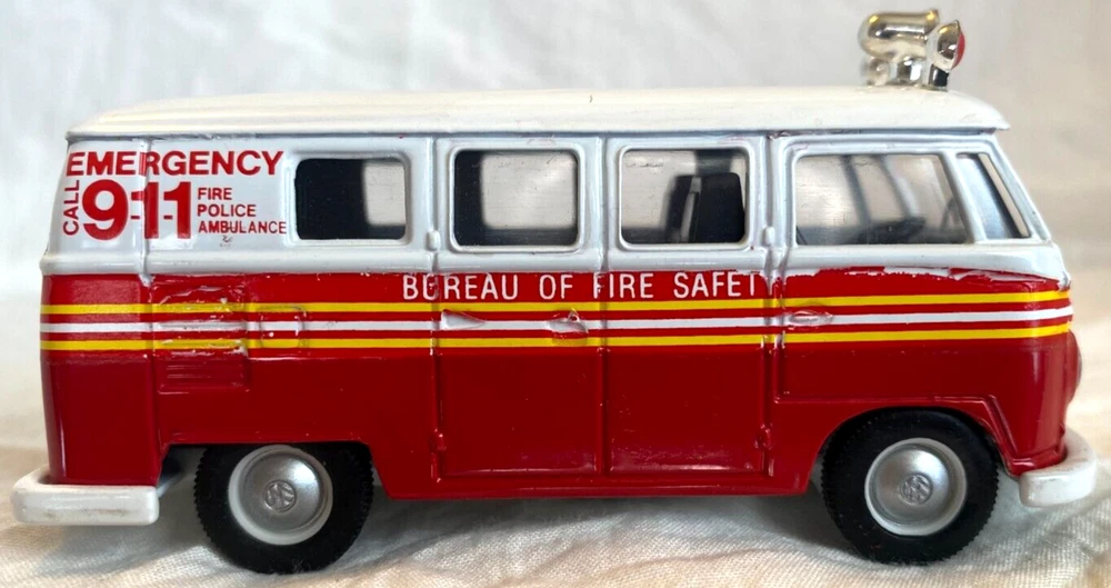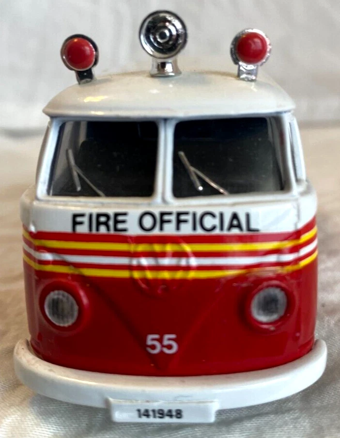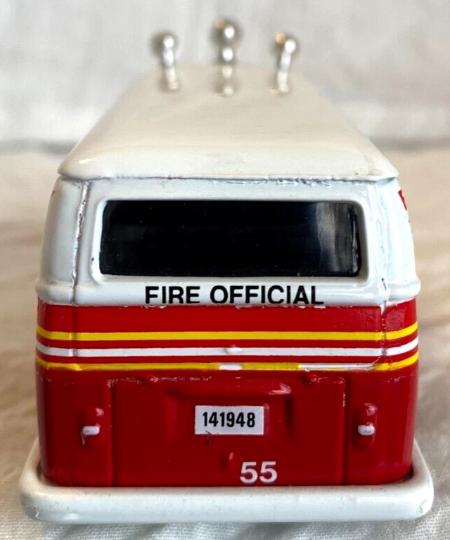 New without the box, nor the Certificate of Authenticity. This Limited Edition Corgi Classic Volkswagen Van VW-Type 2 Fire Marshall is a true Collectors prize. There were 11,500 made and this one is #55. Stock #98475. Made of Die-Cast Metal at 1:43 Scale. Manufactured in China. Extremely sharp paint job of White over Red with 3 sharp Yellow stripes around the center. The "Bureau Of , but I don't know any particulars about it. Fire Safety" decals really stick out. "Fire Official" on the front & Back top it off. It has a license plate on the front and back "141948" Smoke Free Environment Stored for 25+ years (Seller Cat.#0355)