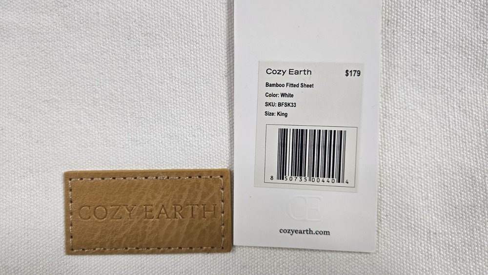 This product is a new Cozy Earth Bamboo King White Fitted Sheet that comes with a canvas bag. The fitted sheet is made of bamboo material, known for its softness and durability. It features a solid white color and is designed to fit a king-size bed. The care instructions indicate that it is machine washable, making it easy to maintain. Perfect for the bedroom, this product offers both comfort and convenience for a good night's sleep.