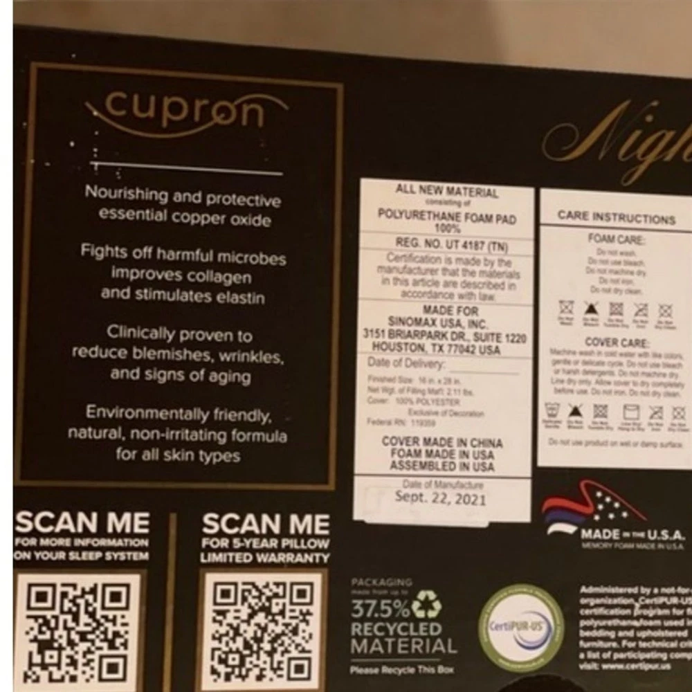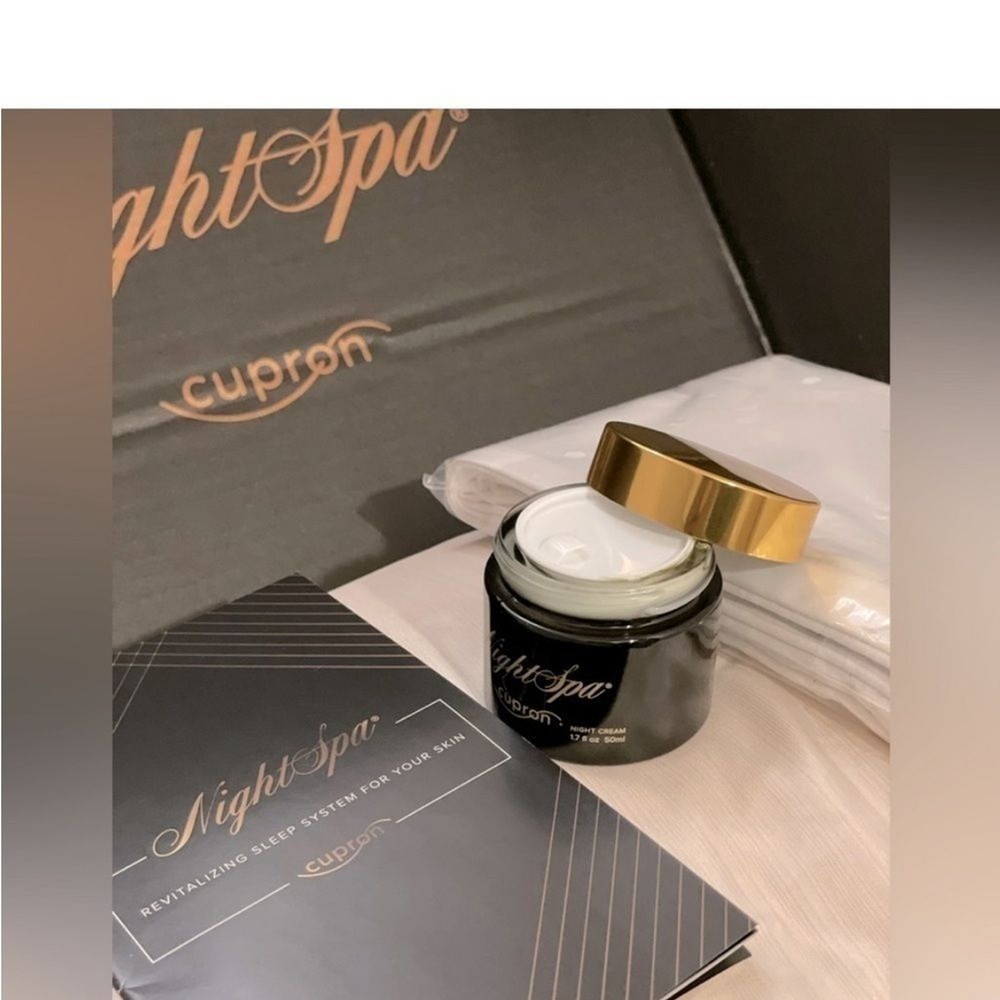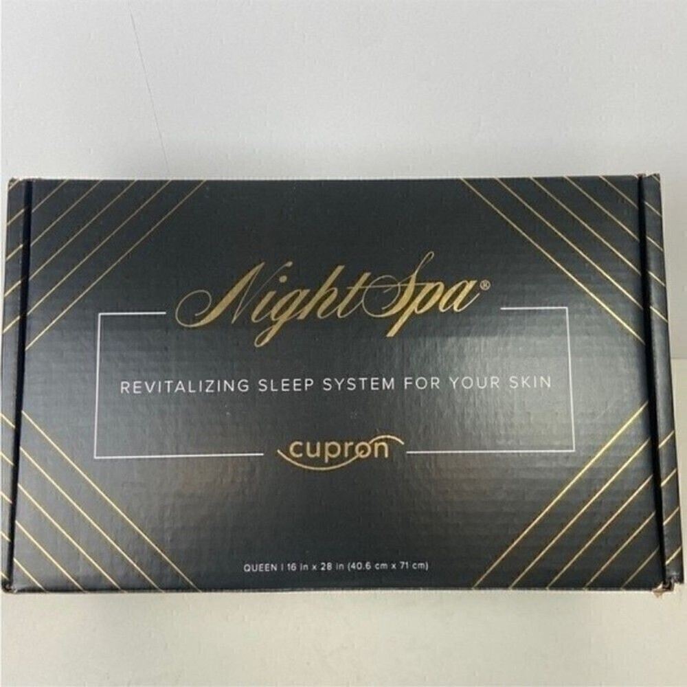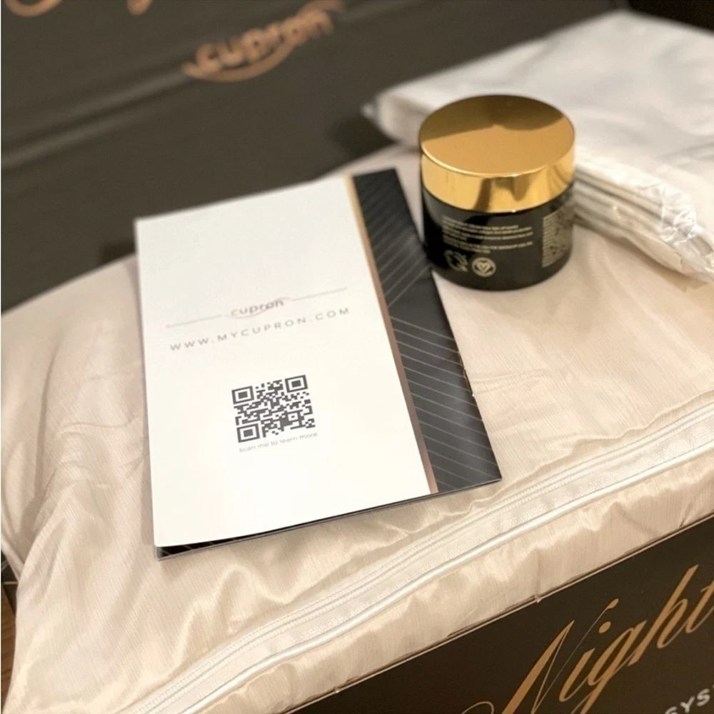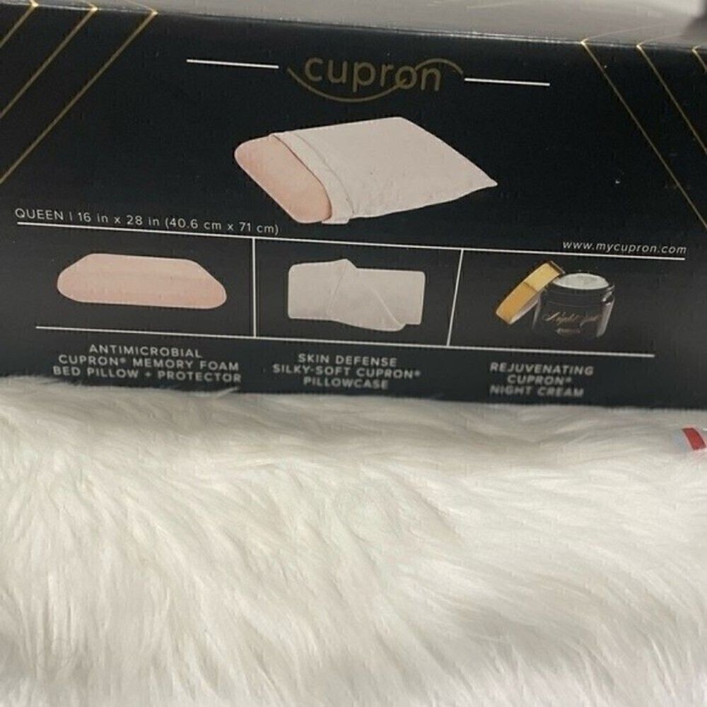 Set includes: Cupron® memory foam pillow, Cupron® pillowcase, Rejuvenating Cupron® Night Cream, pillow protector • Dimensions: gift box (14.625" x 9.625" x 6.4375"), night cream (2"), pillow (16" x 25" x 5"), pillowcase (20" x 30") • Revitalizing sleep system helps even the appearance of skin tone and brighten dull skin, helps reduce blemishes and wrinkles and can help increase the quality of sleep • The pillows memory foam promotes proper spinal alignment, giving you the right balance of comfort and support • 5-year limited warranty (applicable to pillow, protector and pillowcase only) O • Safe and effective for all skin types • Safe sleep with CertiPUR-US® ce
