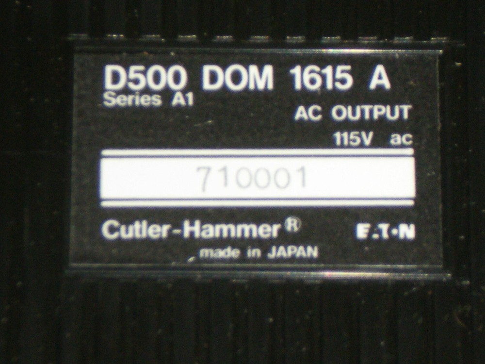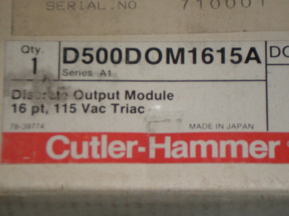 New! Cutler -Hammer D 5 00DOM1615A Triac Output Module 16 pt. 115 VAC 30 day Warranty, Fast Shipping! This is a new Cutler-Hammer output module. The cardboard box is a little worn but the item looks to be in great shape. Please contact me if you have any questions. If you have any problems, return item to me in the same condition that it was sent to you and I will refund the purchase price (less shipping cost) for 30 days. PAYMENT TERMS and SHIPPING: Payment must be received within 7 business days of end of auction unless other arrangements are made beforehand. Item is guaranteed to ship within three business days, but in most cases item will ship within one business day of payment. Please email me if you need this item rushed. I can ship UPS Overnight in many cases and am willing to use your UPS account number. Contact me with your UPS account number, the type of shipping service (Standard Overnight, AM Delivery, Early AM Delivery) and specify if you desire insurance. Use the link below to find our contact information, or contact me through Ebay. There may be an additional handling fee for Overnight services in cases where the item is paid for later in the afternoon (contact me for details). Foreign buyers are responsible for all customs charges. Foreign buyers please provide a contact phone number to be used on the customs form. INDEMNITY: Buyer shall, at no expense to the Seller, indemnify, defend and hold the Seller harmless against any and all losses, damages and expense (including punitive damages, multiple damages, attorney fees and other costs of defending any action) Seller may incur as a result of any claim made against the Seller by any person, including without limitation, Buyer, it's successors, assigns, representatives, agents, employees, insurers, and customers, actually or allegedly arising out of the regarding the transportation, installation or use of the equipment sold hereunder by Seller or out of any products manufactured or sold by Buyer, including, without limitation, any claim which in whole or in part actually or allegedly arises out of (a) Seller's negligent or other wrongful act or omission, (b) danger or default in any equipment sold by Seller to Buyer, (c) infringement by Seller of any patent, copyright, or trade secret relating to any equipment sold by Seller to Buyer. Shelf Unit B15 Listing and template services provided by inkFrog