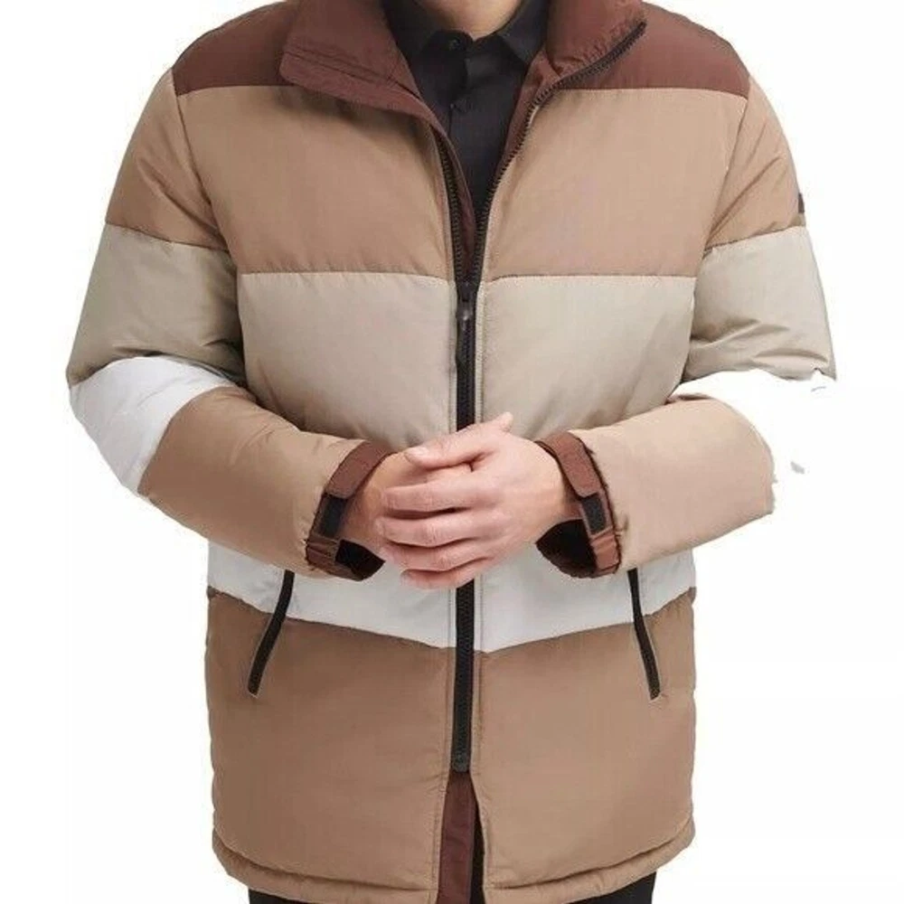 Step into both style and comfort for cold evening on the town with the bold, runway-ready quilted body and heavyweight design of this fresh take on the classic walking coat from DKNY. Heavyweight Regular fit Zip-through collar; full-zip front closure Two welt zipper pockets DKNY logo plaque on left sleeve; colorblock style (brown colorway); mixed media (red colorway) adjustable cuffs Shell: faux memory/patent faux leather polyurethane (red colorway); polyester faux memory (brown colorway); body lining: nylon; sleeve lining: polyester; DXIMP666 Age Group adult Gender male Color brown combo