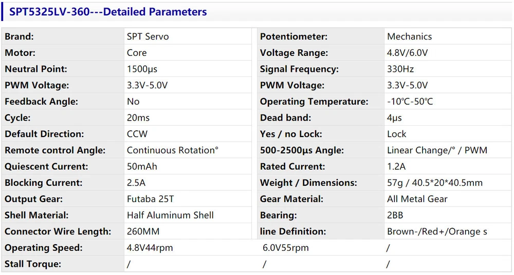 Product Description If you have any questions, please contact customer service first, do not open disputes easily, thank you! Specification : Name:SPT5325LV-360 Brand:SPT servo machine Potentiometer:Mechanics Motor:iron core Voltage range:4.8V/6.0V Neutral point:1500μs Signal frequency:330Hz PWM voltage:3.3V-5.0V Feedback angle:None Operating temperature:-10℃-50℃ Cycle time:20ms Deadband:4μs Default direction:CCW Yes/No Lock:Lock Remote angle:Continuous rotation d° 500-2500μs Angle:Linear change/°/PWM Static current:50mAh Rated current:1.2A Output gear:Futaba 25T Gear material:All-metal gear Housing material:Half aluminum housing Bearing:2BB Connector wire length:260MM Line definition:Brown-/red+/orange s Running speed:4.8V-44rpm, 6.0V-55rpm Package includes : 1*SPT5325LV-360 dual-axis servo 2*Metal gear Note : Only include the above package products About Us We accept all payments authorized by eBay. About Us We accept all payments authorized by eBay. powered by