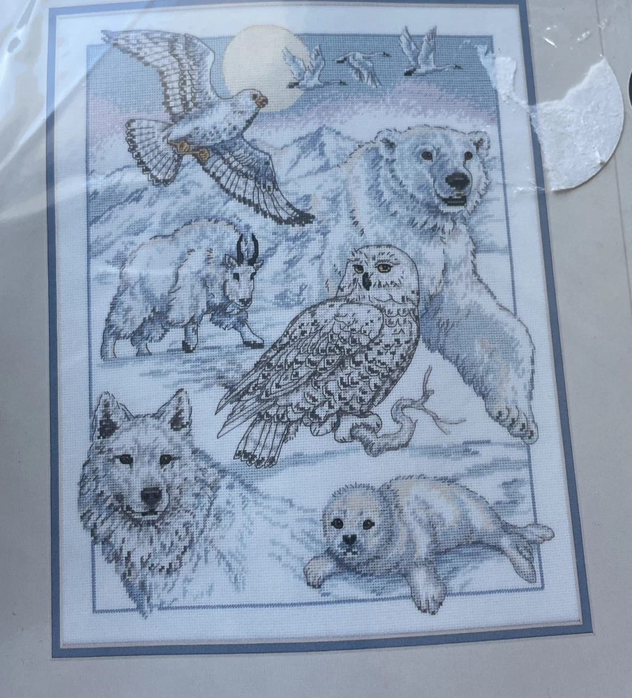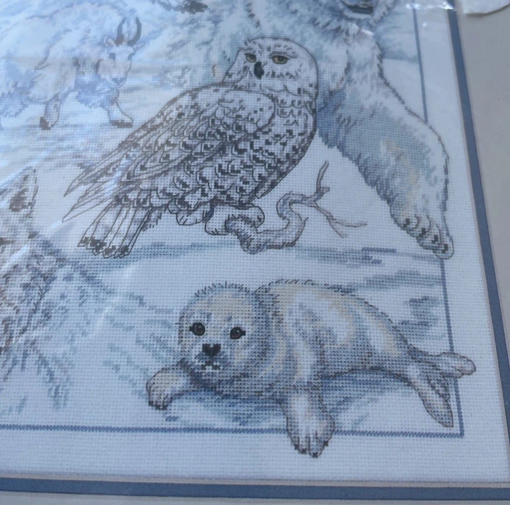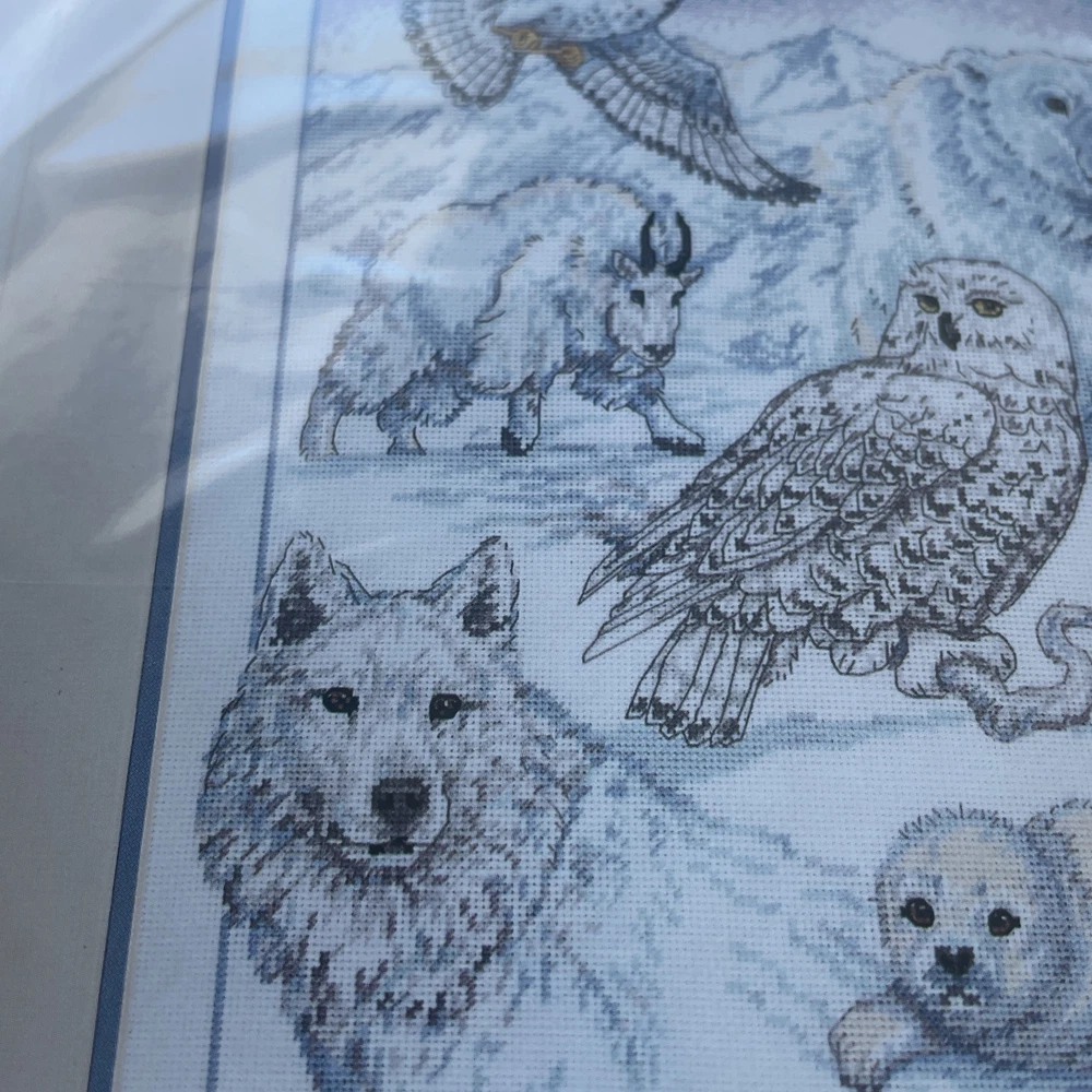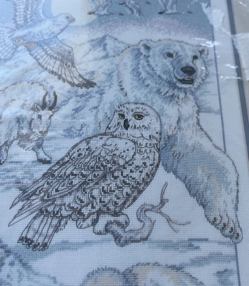 Wow! Another gorgeous piece of art from Michael Adams. Counted cross stitch 18 count white Aida cloth. Eagle owl polar bear seal wolf. They are all in this piece. 11 X 14”. See photos