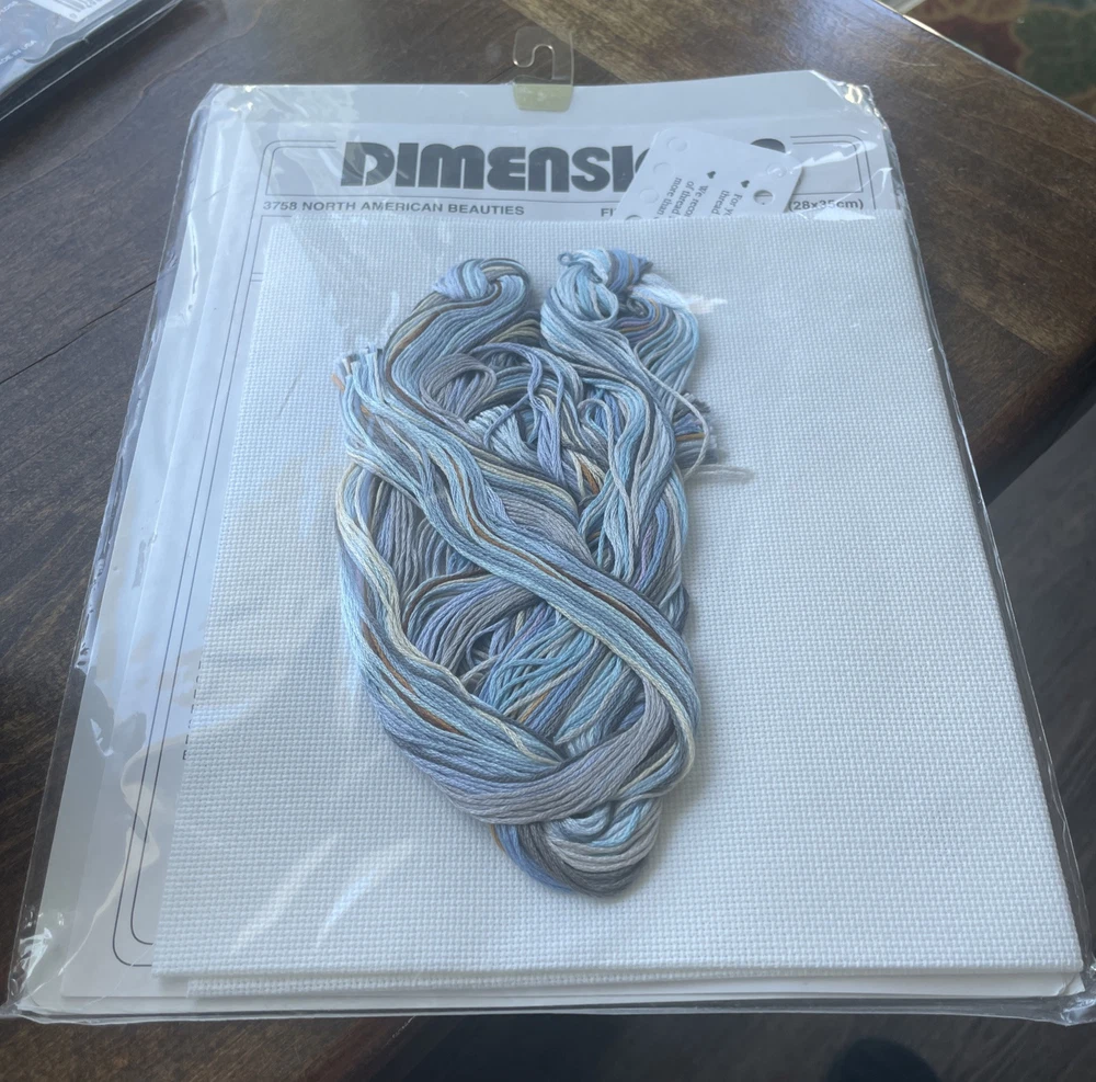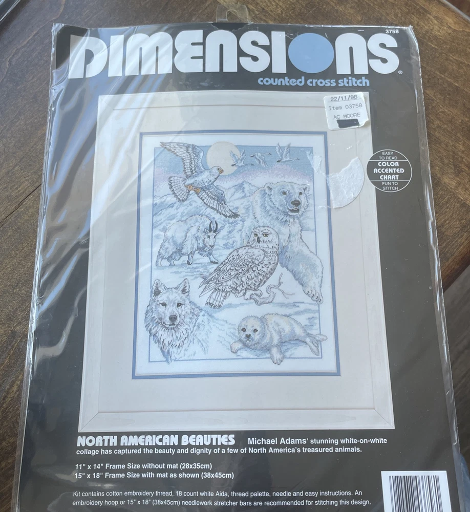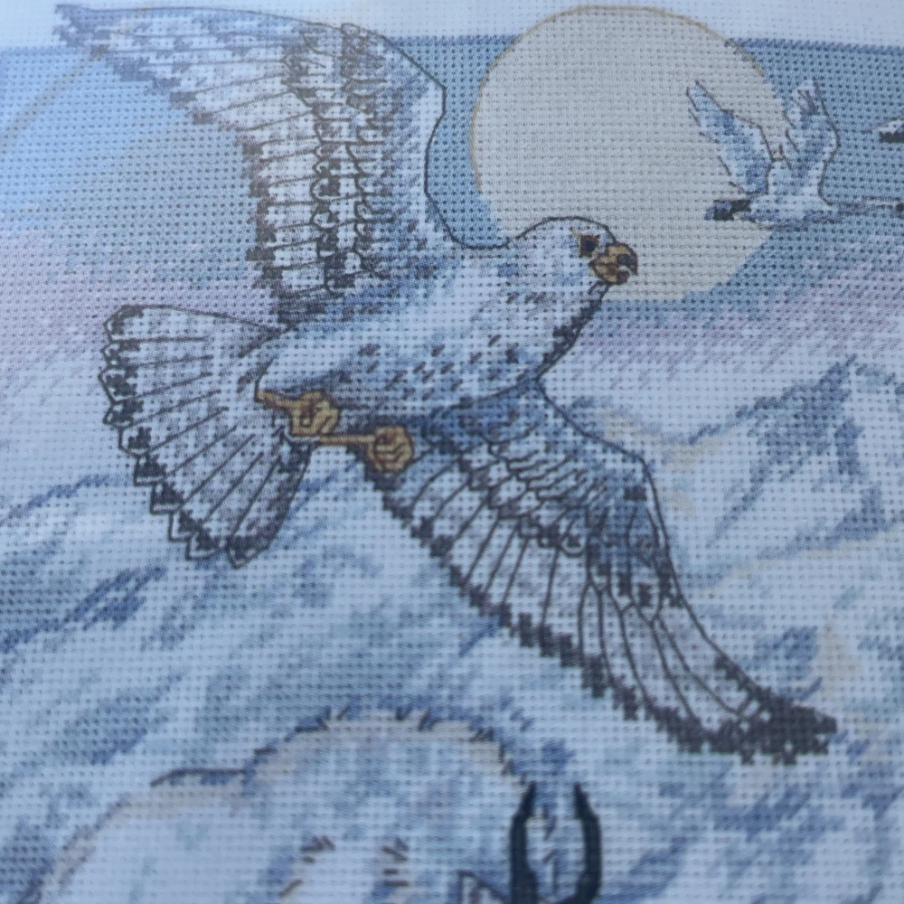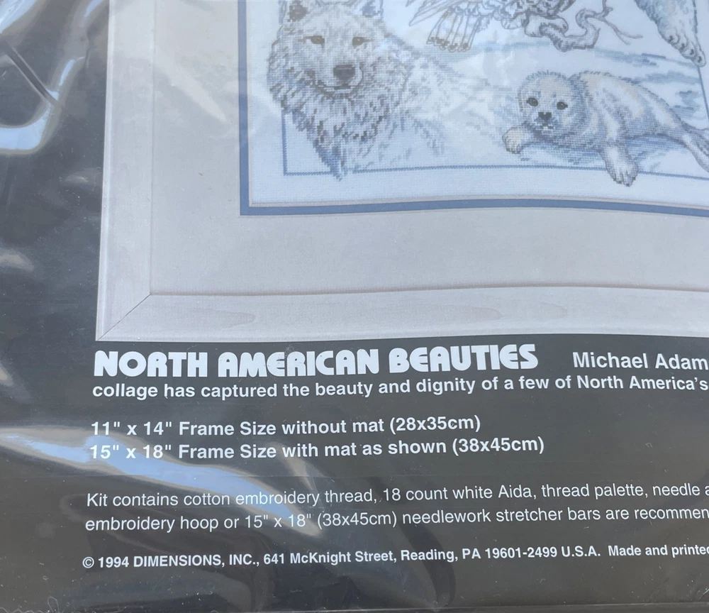 Wow! Another gorgeous piece of art from Michael Adams. Counted cross stitch 18 count white Aida cloth. Eagle owl polar bear seal wolf. They are all in this piece. 11 X 14”. See photos