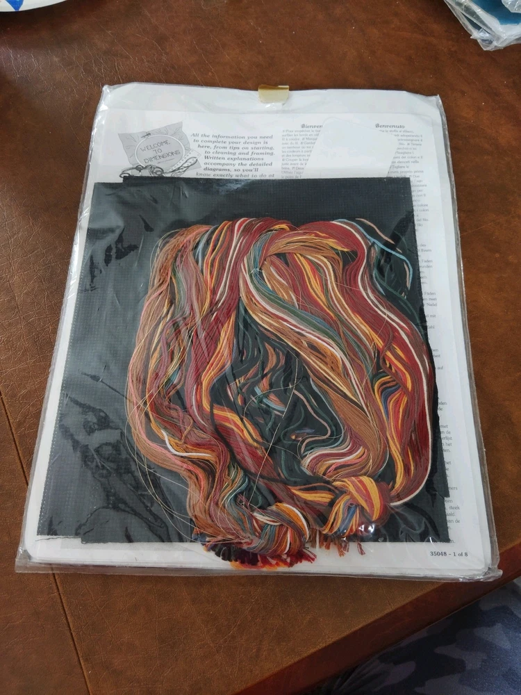 The product is a New Dimensions Frederick the Literate Cat Counted Cross Stitch Kit (Model 35048) featuring an Animals & Insects theme. It includes all necessary supplies such as a needle, fabric/cloth, and thread/floss to create a framed picture of the cat. The style is for a frame and it is a complete kit for cross stitching.