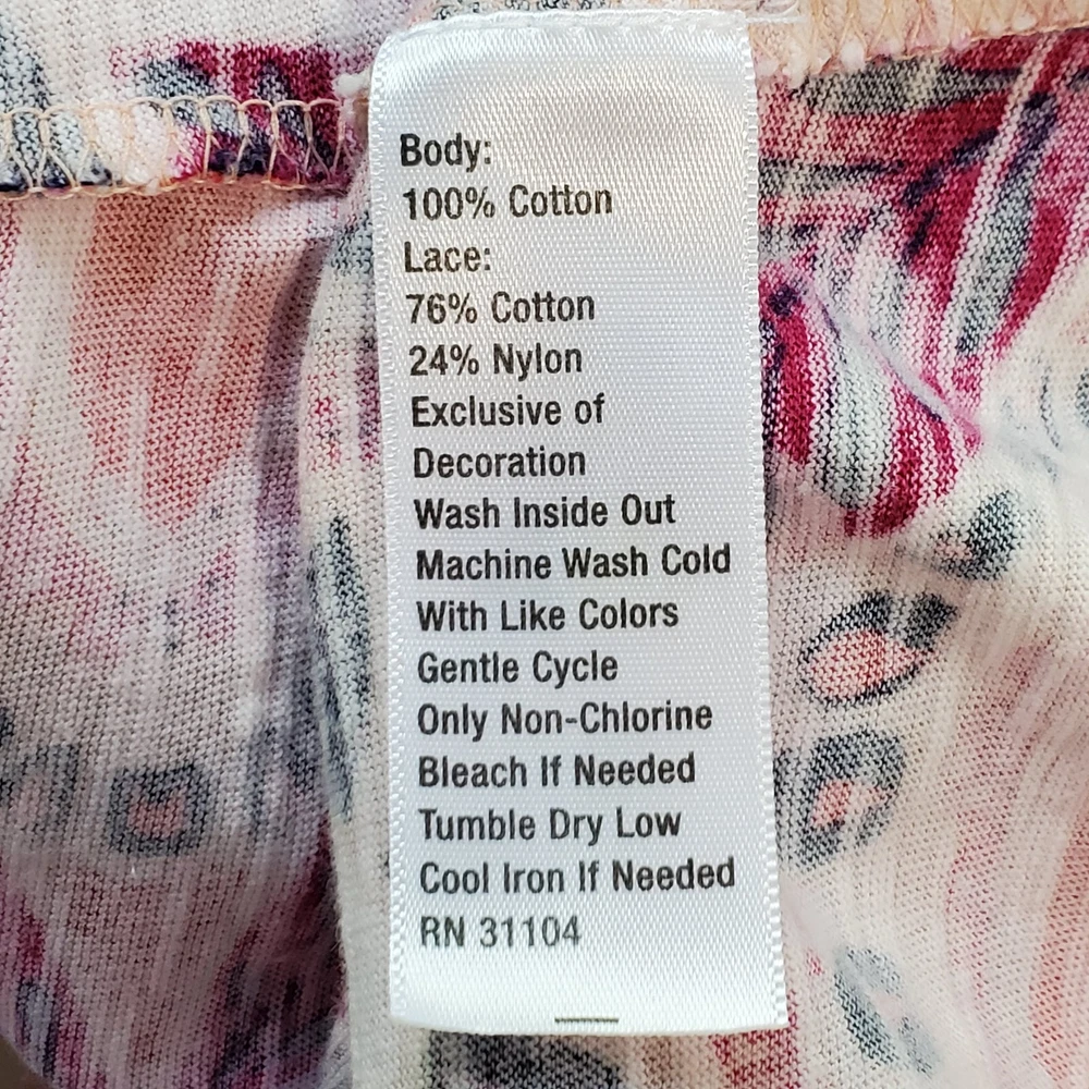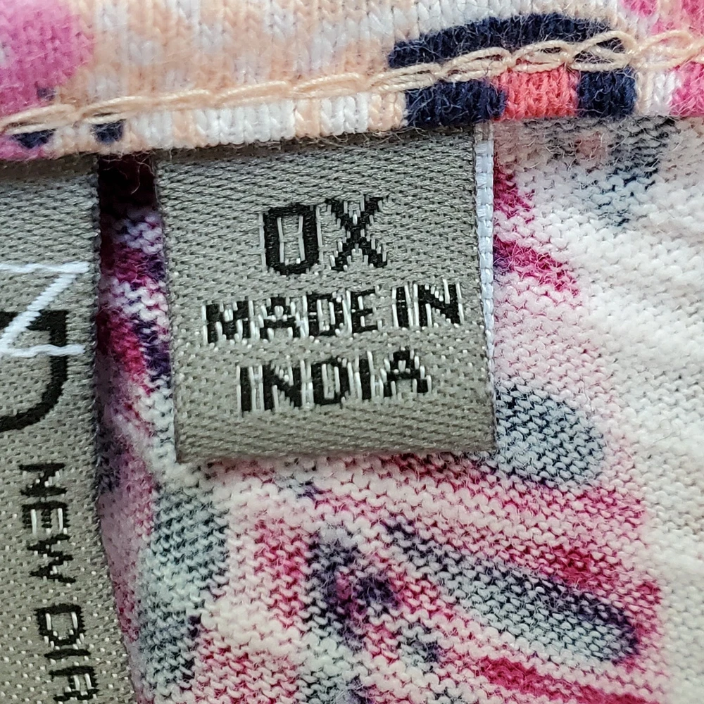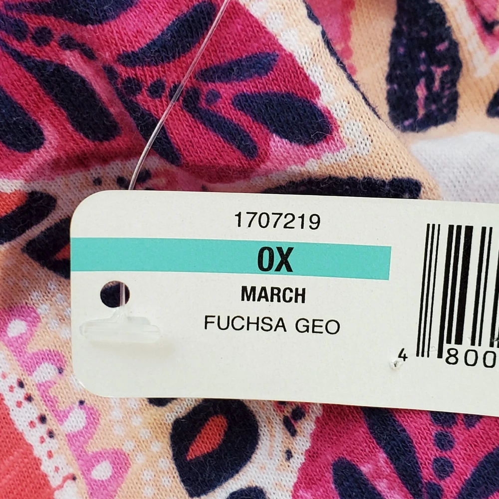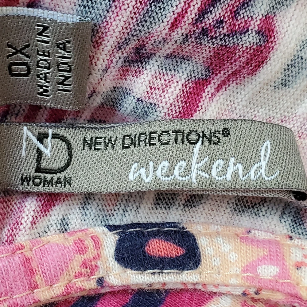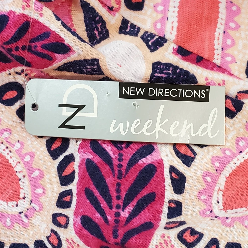 New Directions Weekend Geometric Floral Leaves Cap Sleeve Knit Top NEW NWT Size 0X Pullover summer top with mesh cap sleeves Fuchsia, pink, peach, navy, white Back tassel tie keyhole Has stretch Body 100% cotton, lace mesh cotton, nylon blend Breathable NWT - New With Tag Pictured on woman's XL Dess Form Notice: Color may differ from your computer, phone or device display Relaxed flat lay measurements are approximate, fit not guaranteed. Pit to pit: 22 1/2" Front Length down center: 23" Front Length shoulder to hem: 27 1/4" Back Length down center: 28" Hem Width front side to side: 27" EE870B M62822 9106 **5.9oz 70424 EBMP1 summer top flowers leaves mesh cap sleeves pullover breathable tassel tie back plus size top plus size blouse