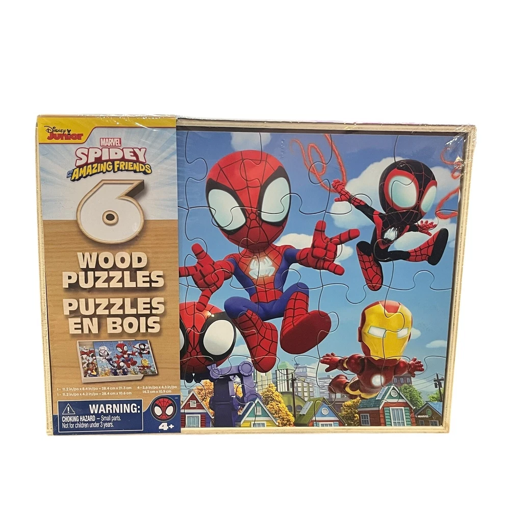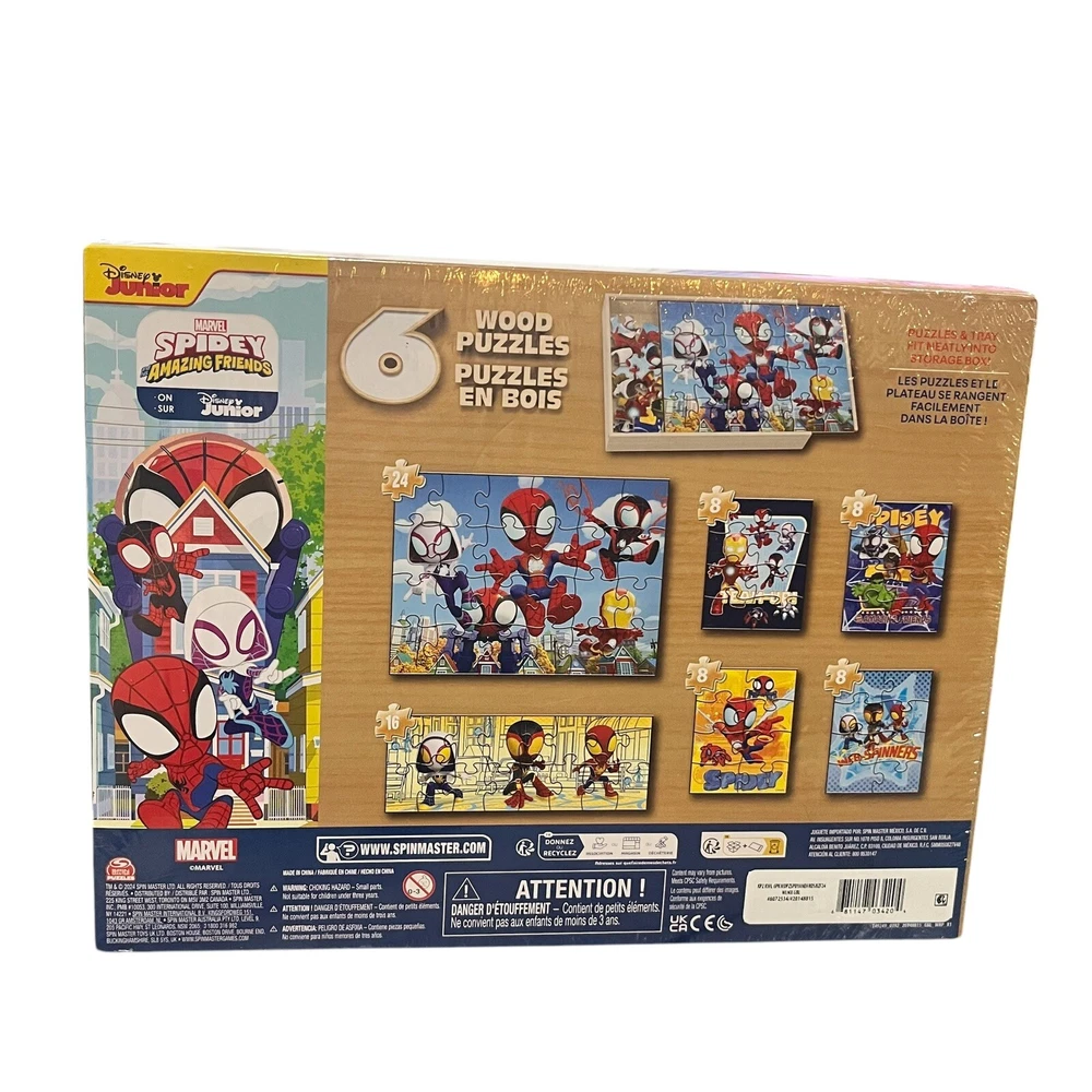 New! Disney Junior 6 Wood Puzzles Spidey & Amazing Friends Built In Storage Box