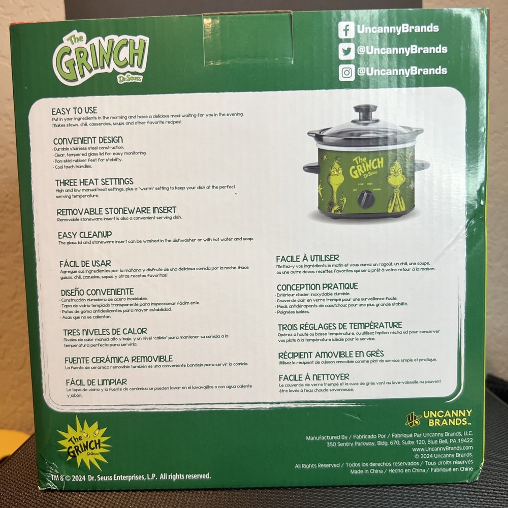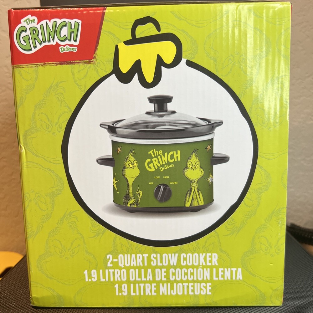 The Dr. Seuss THE GRINCH 2 QUART SLOW COOKER Crock Pot by HOBBY LOBBY is a colorful electric slow cooker with a capacity of 2 quarts. It features a Keep Warm function and has 3 settings/programs for versatility. The components included are a pot, lid, and base, making it easy to use and clean. This model, HL9199080, is designed with a fun Grinch theme, perfect for adding some whimsy to your kitchen.