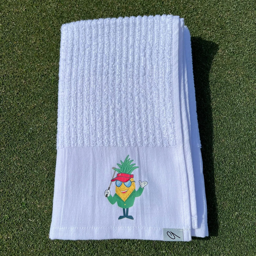 Hello friends or might I say "patrons".....We've decided to pay homage to that little April tradition with our pineapple mascot. It's every golfers favorite time of year and probably most everyone's favorite tournament to watch. With how hospitable and iconic the Green Jackets are at the tournament...we've taken our Pineapple Hospitality Mascot and decked him out in the iconic Green Jacket. Keeping it as exclusive as the tourney....we've made this a limited edition collection. There is a gift set option for all 3 items which includes the cutout ball marker, Tour caddie golf towel and a sticker. Sorry no golden ticket to the tournament though. So no matter how you swing, this gift set will make any golfer feel like they got a piece of that April tradition. Our caddie or caddy golf towel (p otato, potahto ) is printed with a hybrid screen print heat transfer process in color . This golf towel is a super soft, durable golf towel and a solid bag swag addition. Just like the Tour Players use, although they pay someone to wipe down their clubs and fill their divots. Makes a great golf accessory gift. Size: 22" x 44" Terrycloth, 86% cotton, 14% Polyester The cut out ball marker is 1.5" or 40mm tall A sticker is included with every purchase.