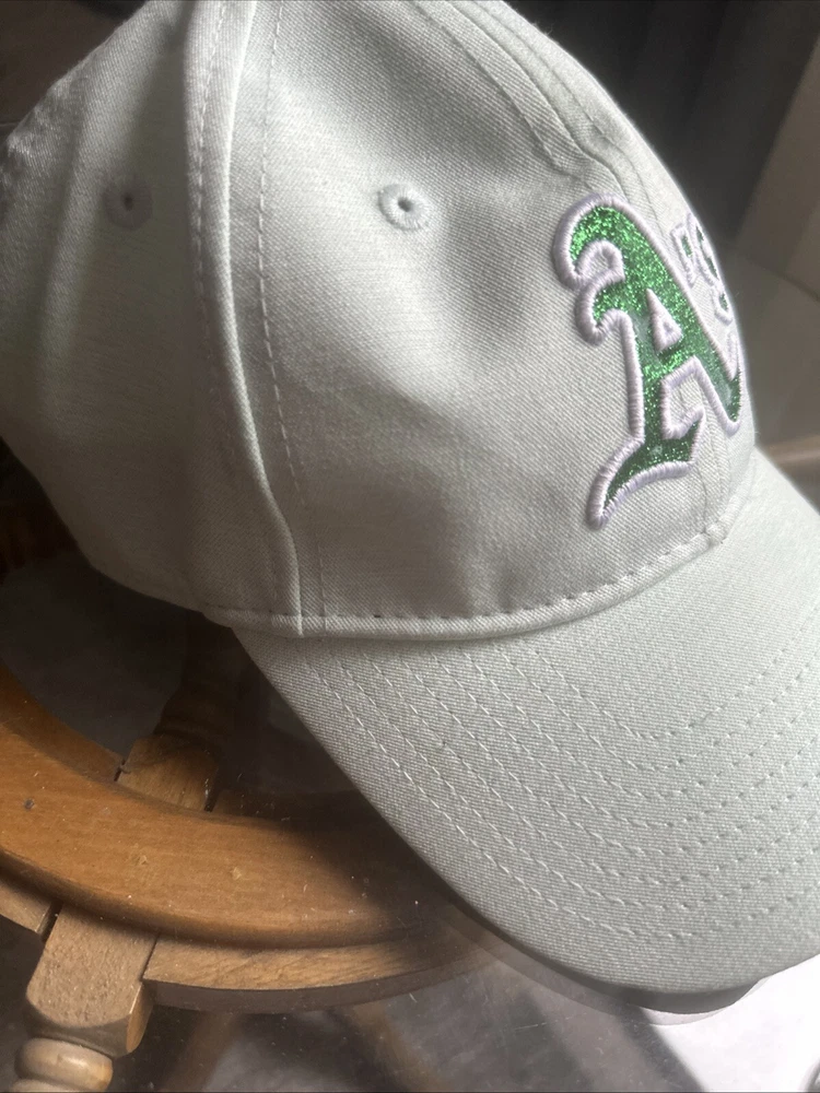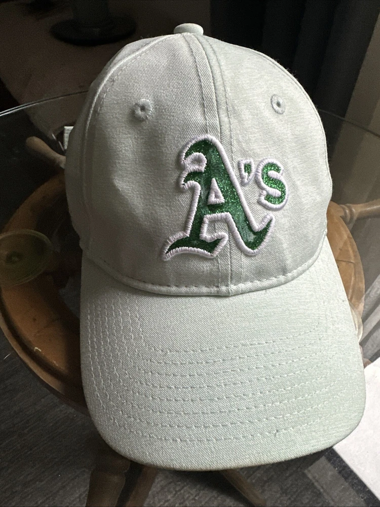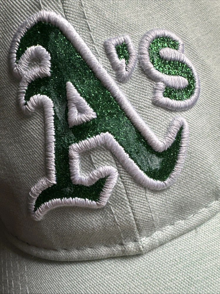 Show off your team pride with this New Era 9twenty Oakland Athletics MLB Strapback Hat in Light Green. This unisex adult hat is officially licensed and perfect for any baseball fan. The hat features the iconic Oakland Athletics team logo and is made with high-quality materials to ensure durability and comfort. The hat is one size fits all and has a strapback closure for a secure and comfortable fit. The green color adds a pop of color to any outfit, and the sparkles on the logo add a touch of fun. This hat is perfect for game day or everyday wear. Get yours now and show your support for the Oakland Athletics!