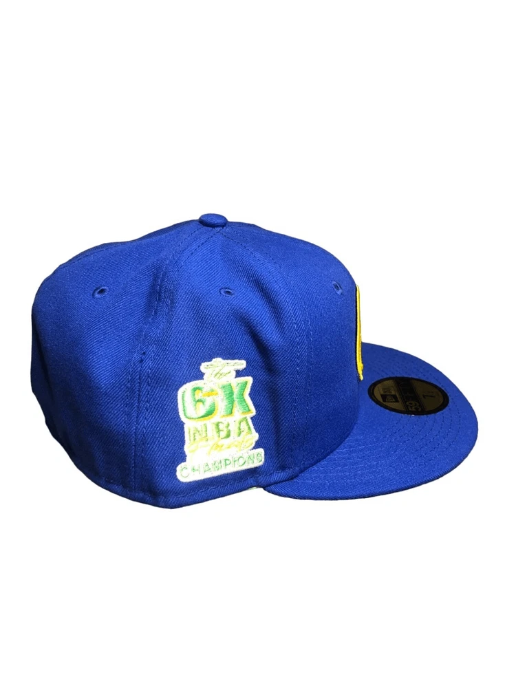 New Era Golden State Warriors Pop Citrus 59FIFTY Hat cap Size 7 1/8 - New with tags - Blue/ Gold/ Green - Fitted 7 1/8 - Embroidered 6x NBA Finals Champs patch and new era on sides, NBA logo on back, and Golden State Warriors patch on front - 6 Panel construction with embroidered eyelets - Fitted hat - High crown; flat bill - Green brim of hat - Durable polyester blend fabric