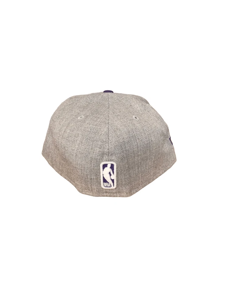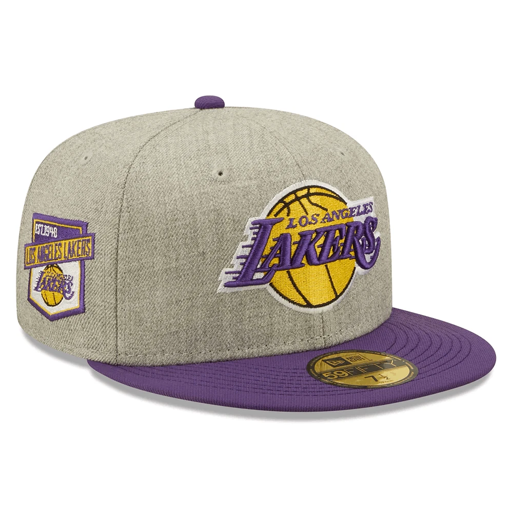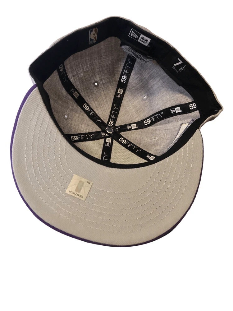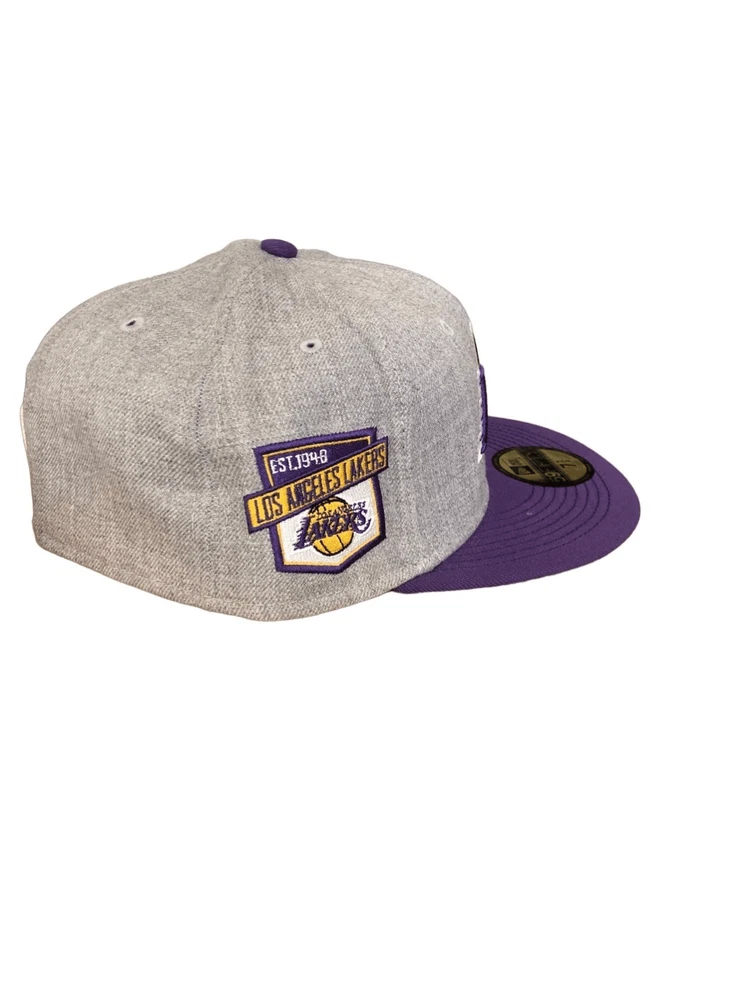 New Era Los Angeles Lakers 59FIFTY fitted hat cap size 7 1/2 - Heather Grey/ Purple - New with tags - embroidery on front,back, and Los Angeles 1948 patch on side - flat brim with grey underside